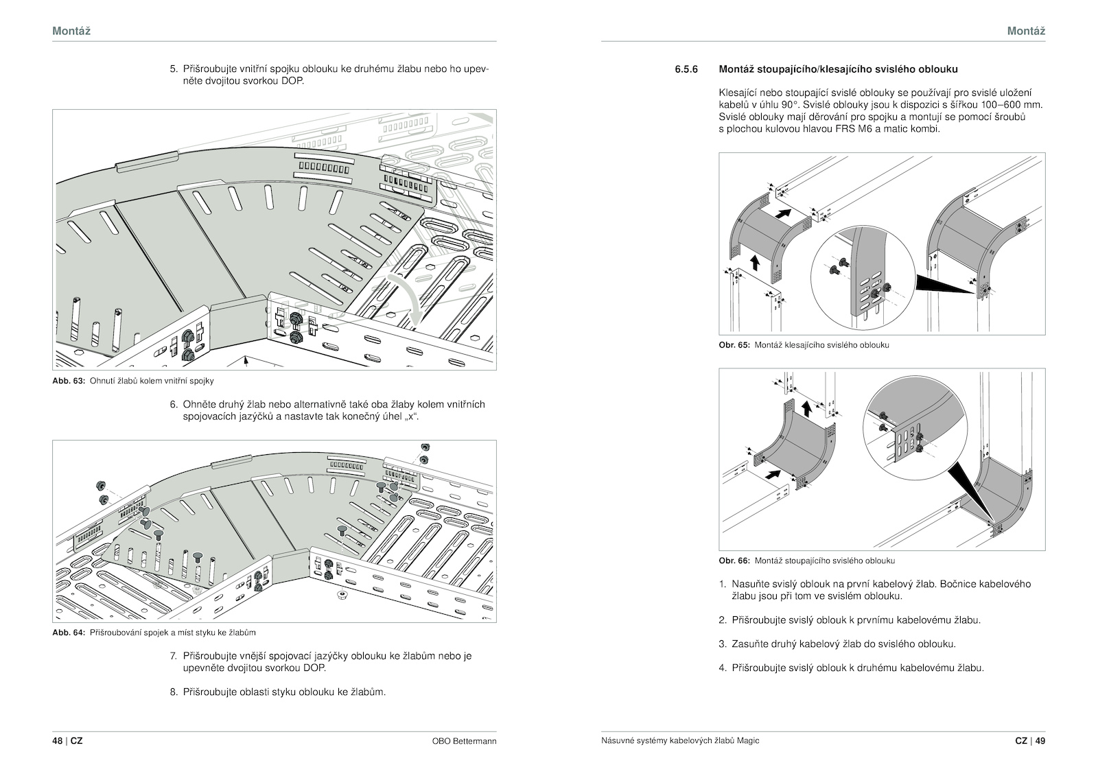 Svislé oblouky jsou dispozici šířkou 100–600 mm. 66: Montáž stoupajícího svislého oblouku 1. Ohněte druhý žlab nebo alternativně také oba žlaby kolem vnitřních spojovacích jazýčků nastavte tak konečný úhel „x“. Zasuňte druhý kabelový žlab svislého oblouku. 4. Přišroubujte svislý oblouk druhému kabelovému žlabu. Přišroubujte vnitřní spojku oblouku druhému žlabu nebo upev- něte dvojitou svorkou DOP. 2. Abb. 63: x Ohnutí žlabů kolem vnitřní spojky 6. Svislé oblouky mají děrování pro spojku montují pomocí šroubů s plochou kulovou hlavou FRS matic kombi. CZ 49 Násuvné systémy kabelových žlabů Magic Montáž 6.5. Přišroubujte oblasti styku oblouku žlabům. Bočnice kabelového žlabu jsou při tom svislém oblouku. 3. 64: Přišroubování spojek míst styku žlabům 7. Nasuňte svislý oblouk první kabelový žlab. 8. Přišroubujte svislý oblouk prvnímu kabelovému žlabu. .6 Montáž stoupajícího/klesajícího svislého oblouku Klesající nebo stoupající svislé oblouky používají pro svislé uložení kabelů úhlu 90°. Obr.Montáž 48 OBO Bettermann 5. Abb. Přišroubujte vnější spojovací jazýčky oblouku žlabům nebo je upevněte dvojitou svorkou DOP. 65: Montáž klesajícího svislého oblouku Obr