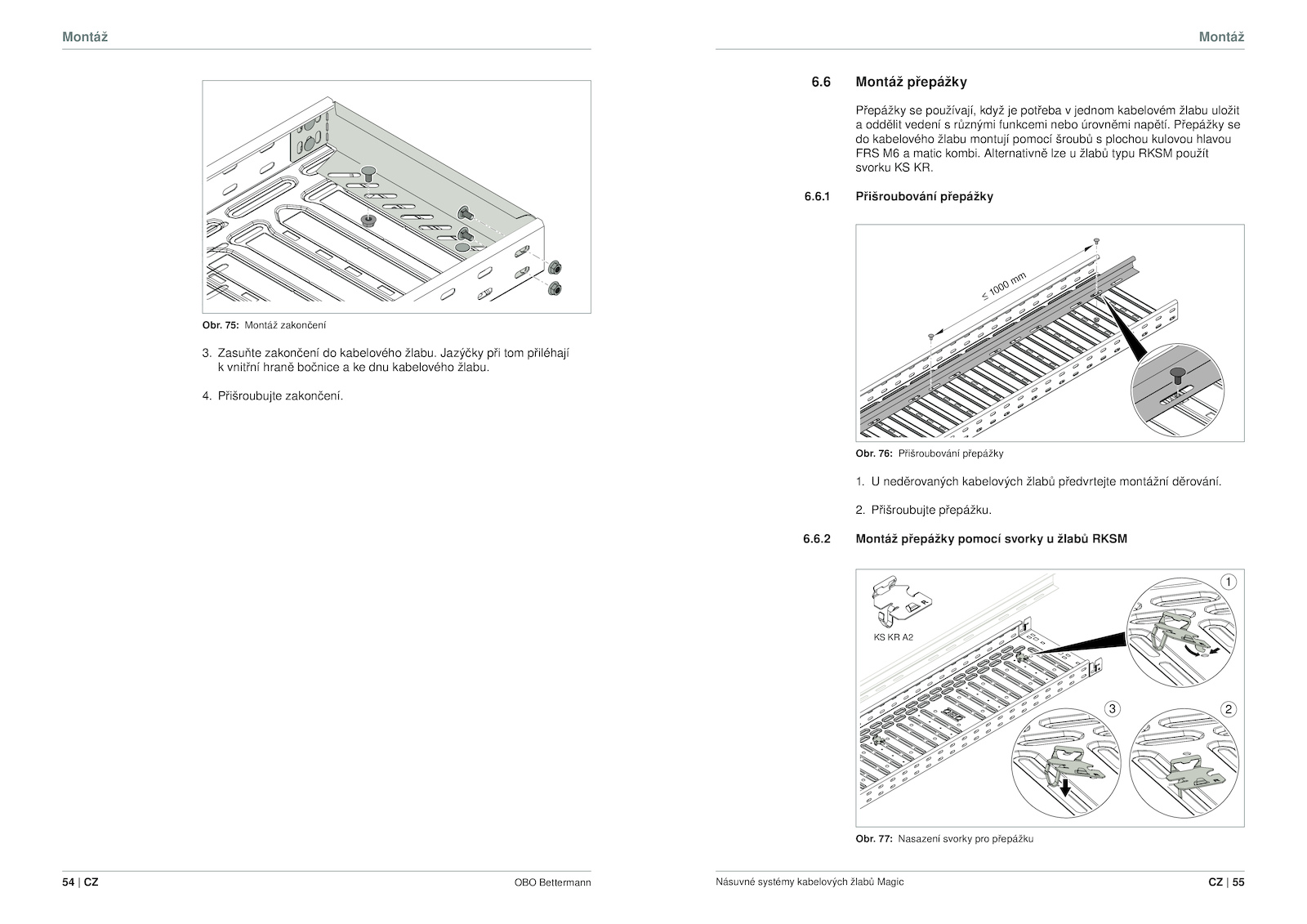Přepážky se do kabelového žlabu montují pomocí šroubů plochou kulovou hlavou FRS matic kombi.Montáž 54 OBO Bettermann Obr. 75: Montáž zakončení 3. Přišroubujte zakončení. Přišroubujte přepážku.6 Montáž přepážky Přepážky používají, když potřeba jednom kabelovém žlabu uložit a oddělit vedení různými funkcemi nebo úrovněmi napětí.6. 2.6. Alternativně lze žlabů typu RKSM použít svorku KR. 76: ≤ 1000 mm Přišroubování přepážky 1.1 Přišroubování přepážky Obr. 77: KS A2 1 2 3 Nasazení svorky pro přepážku .2 Montáž přepážky pomocí svorky žlabů RKSM Obr. Zasuňte zakončení kabelového žlabu. Jazýčky při tom přiléhají k vnitřní hraně bočnice dnu kabelového žlabu. 6. 4. 6. CZ 55 Násuvné systémy kabelových žlabů Magic Montáž 6. neděrovaných kabelových žlabů předvrtejte montážní děrování