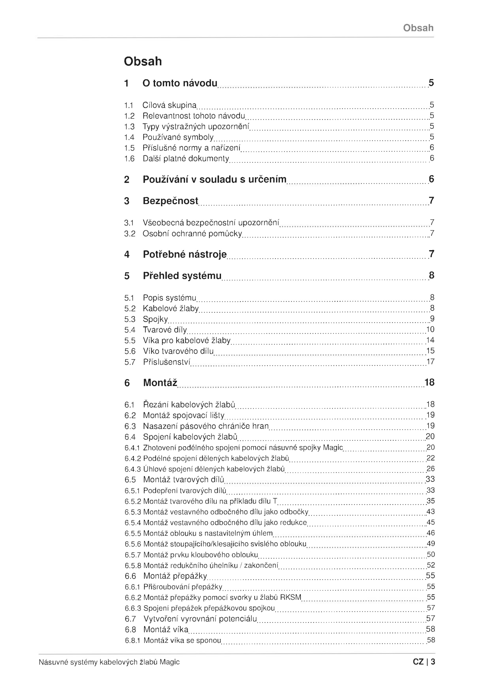 .55 6...............................................................................19 6.....1 Zhotovení podélného spojení pomocí násuvné spojky Magie...........................................1 Řezání kabelových žlabů........1 Podepření tvarových dílů........43 6................................................. 6 2 Používání souladu určením .................6 Montáž přepážky...................................................50 6............................................................................. 8 5...........................................5 1....................................20 6........................3 Typy výstražných upozornění..................9 5....1 Montáž víka sponou........................6.5 1.............................................5 Víka pro kabelové žlaby.....3 Nasazení pásového chrániče hran.............................................45 6..................5.................2 Montáž spojovací lišty................................................................................................6 Víko tvarového dílu 15 5........................................... 7 3..........5 Montáž oblouku nastavitelným úhlem 46 6..7 4 Potřebné nástroje............3 Montáž vestavného odbočného dílu jako odbočky.............................................................................7 Montáž prvku kloubového oblouku.............................................................................5.....5 1.................................4..................................................................26 6................2 Montáž přepážky pomocí svorky žlabů RKSM 55 6..................1 Cílová skupina..................1 Přišroubování přepážky....6 1................................................................................................................................................................2 Montáž tvarového dílu příkladu dílu T..............................................................8..................................5.....................................2 Podélné spojení dělených kabelových žlabů..............2 Osobní ochranné pomůcky.......6...........................................................................................................................................6.................4 Tvarové díly..................................35 6...............................................................................4 Používané symboly..7 Vytvoření vyrovnání potenciálu....................1 Všeobecná bezpečnostní upozornění 7 3...............................58 Násuvné systémy kabelových žlabů Magie...........................5...........8 5.....................................................3 Úhlové spojení dělených kabelových žlabů...............5....................3 Spojení přepážek přepážkovou spojkou.......57 6....8 Montáž redukčního úhelníku zakončení.............................................................................................................................................................................................................................7 Příslušenství 17 6 Montáž ...................................6 Montáž stoupajícího/klesajícího svislého oblouku 49 6...........2 Relevantnost tohoto návodu...........................18 6....................7 5 Přehled systému............20 6..........................................4.........4 Spojení kabelových žlabů................................................................................................5.........55 6.................5.....Obsah Obsah 1 tomto návodu ...........................................8 Montáž víka......................... 58 6....... 22 6......................5 Montáž tvarových dílů 33 6....19 6....4..................5 1.................5 1........................... ............................2 Kabelové žlaby........... 57 6........5 Příslušné normy nařízení.................................. J6 3 Bezpečnost.1 Popis systému.................................................................................... 18 6.................................................52 6....5........................8 5.......................6 Další platné dokumenty.....................33 6...........................................................................14 5............................................................................4 Montáž vestavného odbočného dílu jako redukce..................3 Spojky.............................10 5.