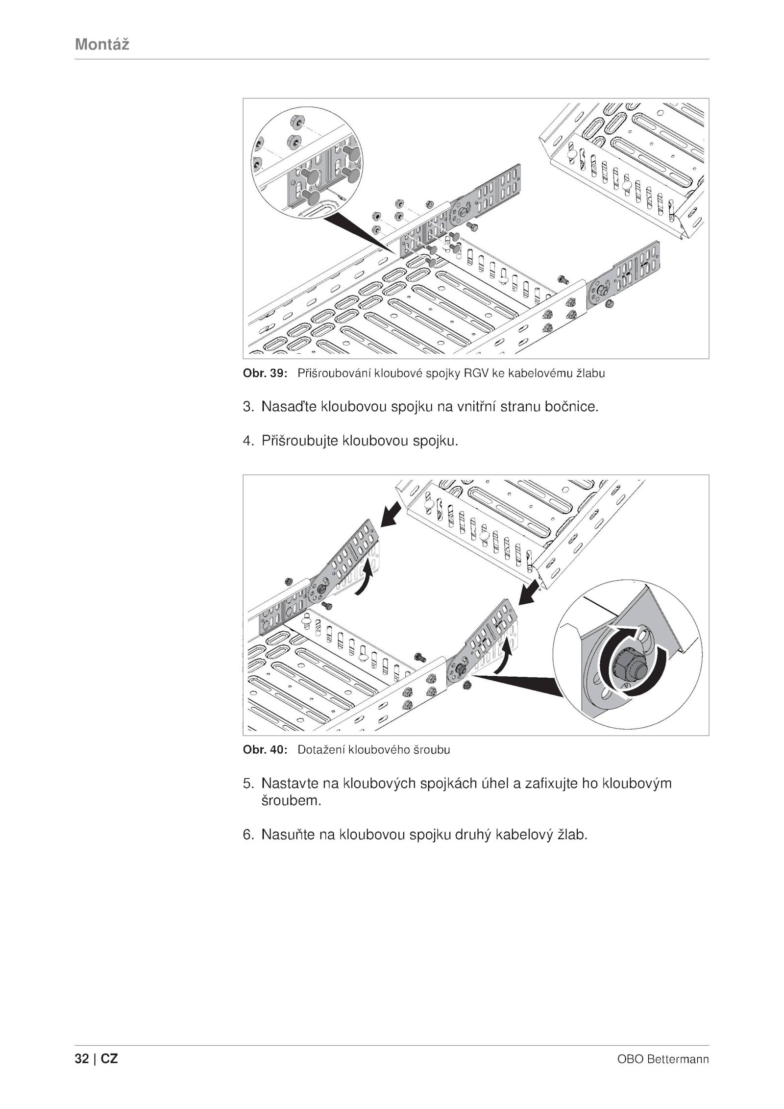 4. 6. 39: Přišroubování kloubové spojky RGV kabelovému žlabu 3.Montáž Obr. 32 OBO Bettermann . Nastavte kloubových spojkách úhel zafixujte kloubovým šroubem. Nasaďte kloubovou spojku vnitřní stranu bočnice. Obr. Přišroubujte kloubovou spojku. Nasuňte kloubovou spojku druhý kabelový žlab. 40: Dotažení kloubového šroubu 5