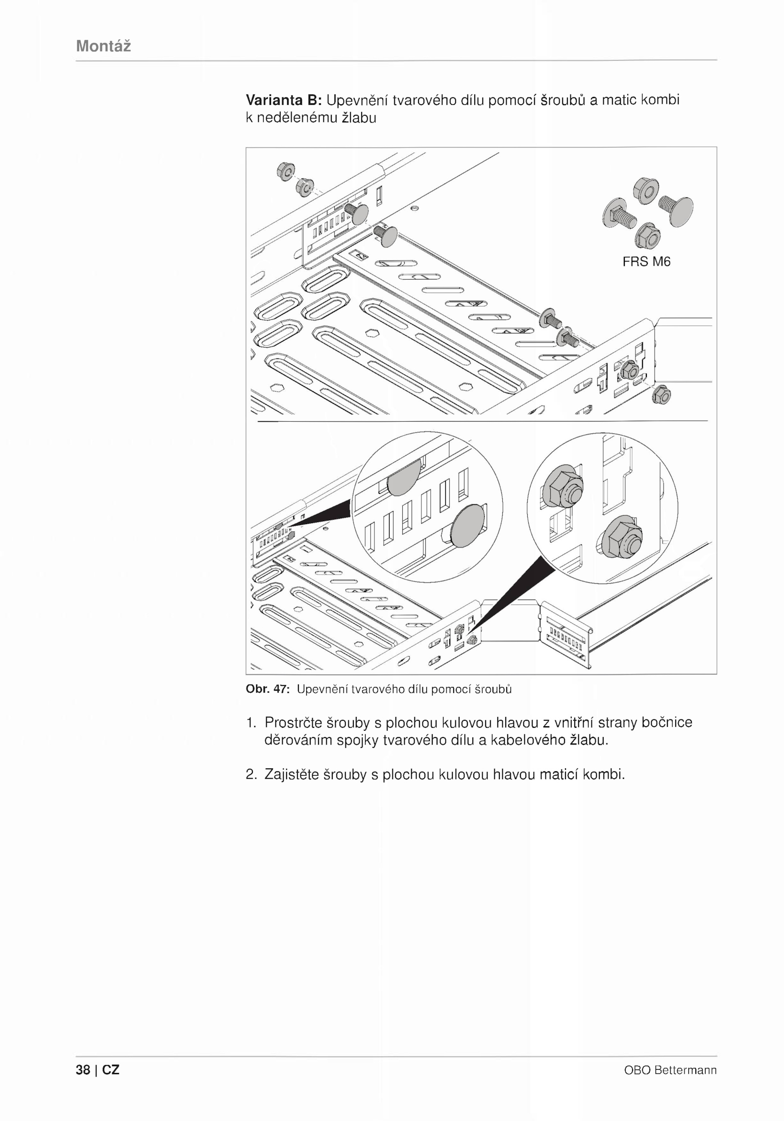 Prostrčte šrouby plochou kulovou hlavou vnitřní strany bočnice děrováním spojky tvarového dílu kabelového žlabu. Zajistěte šrouby plochou kulovou hlavou maticí kombi. 47: Upevnění tvarového dílu pomocí šroubů 1. 38 OBO Bettermann .Montáž Varianta Upevnění tvarového dílu pomocí šroubů matic kombi k nedělenému žlabu Obr. 2