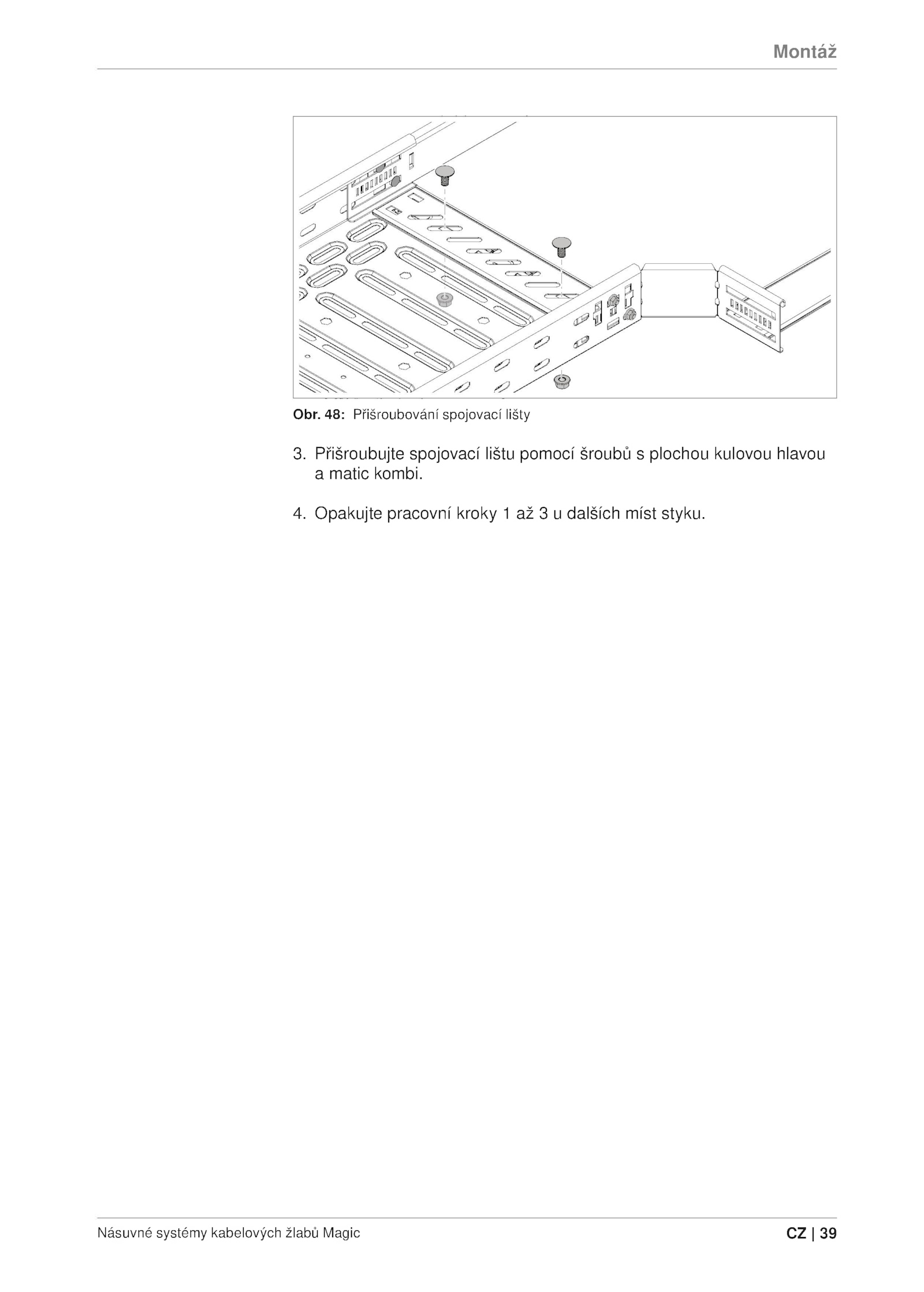 48: Přišroubování spojovací lišty 3.Montáž Obr. Přišroubujte spojovací lištu pomocí šroubů plochou kulovou hlavou a matic kombi. Opakujte pracovní kroky dalších míst styku. Násuvné systémy kabelových žlabů Magie 39 . 4