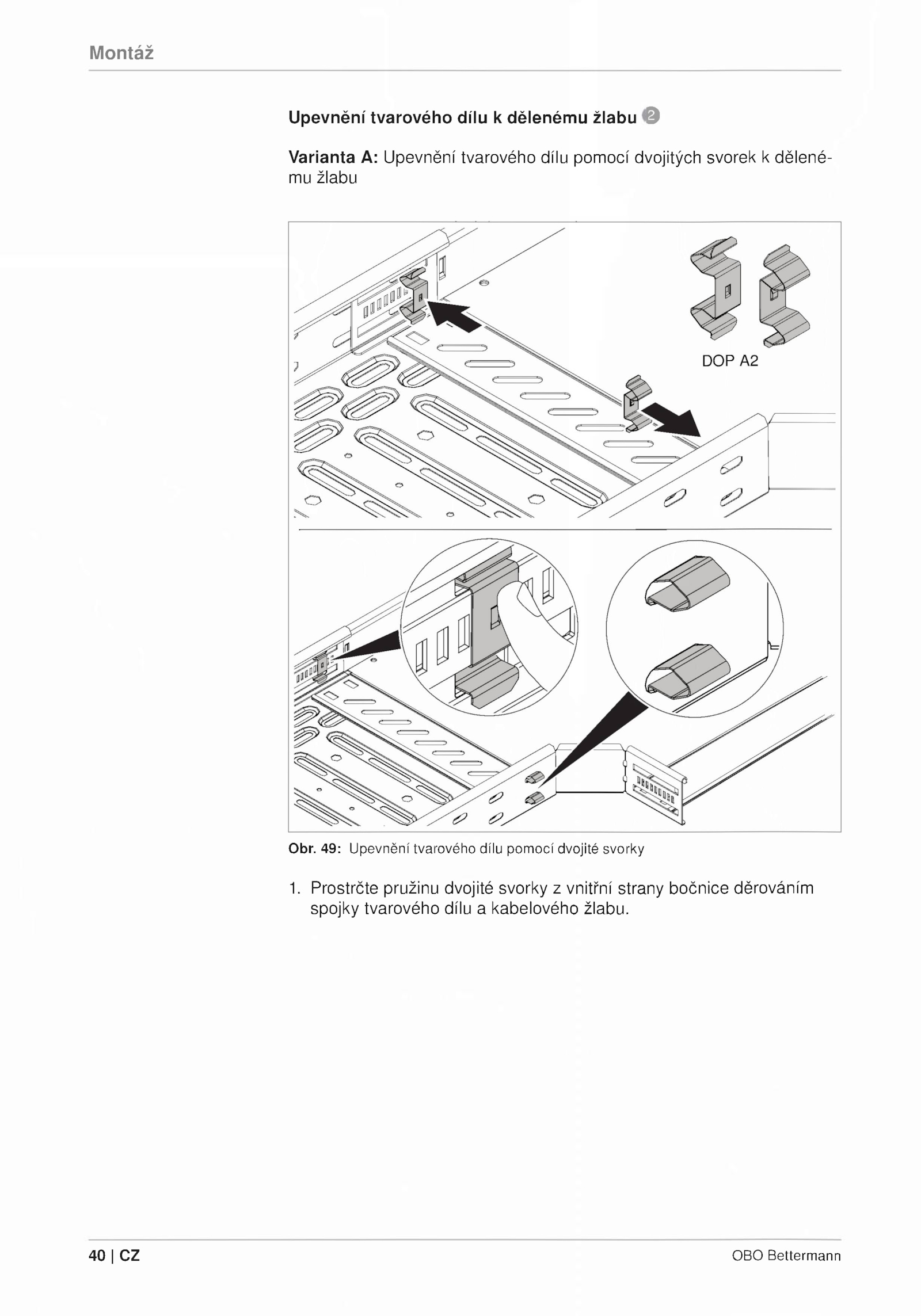 49: Upevnění tvarového dílu pomocí dvojité svorky 1. Prostrčte pružinu dvojité svorky vnitřní strany bočnice děrováním spojky tvarového dílu kabelového žlabu. 40 OBO Bettermann .Montáž Upevnění tvarového dílu dělenému žlabu 9 Varianta Upevnění tvarového dílu pomocí dvojitých svorek dělené mu žlabu Obr
