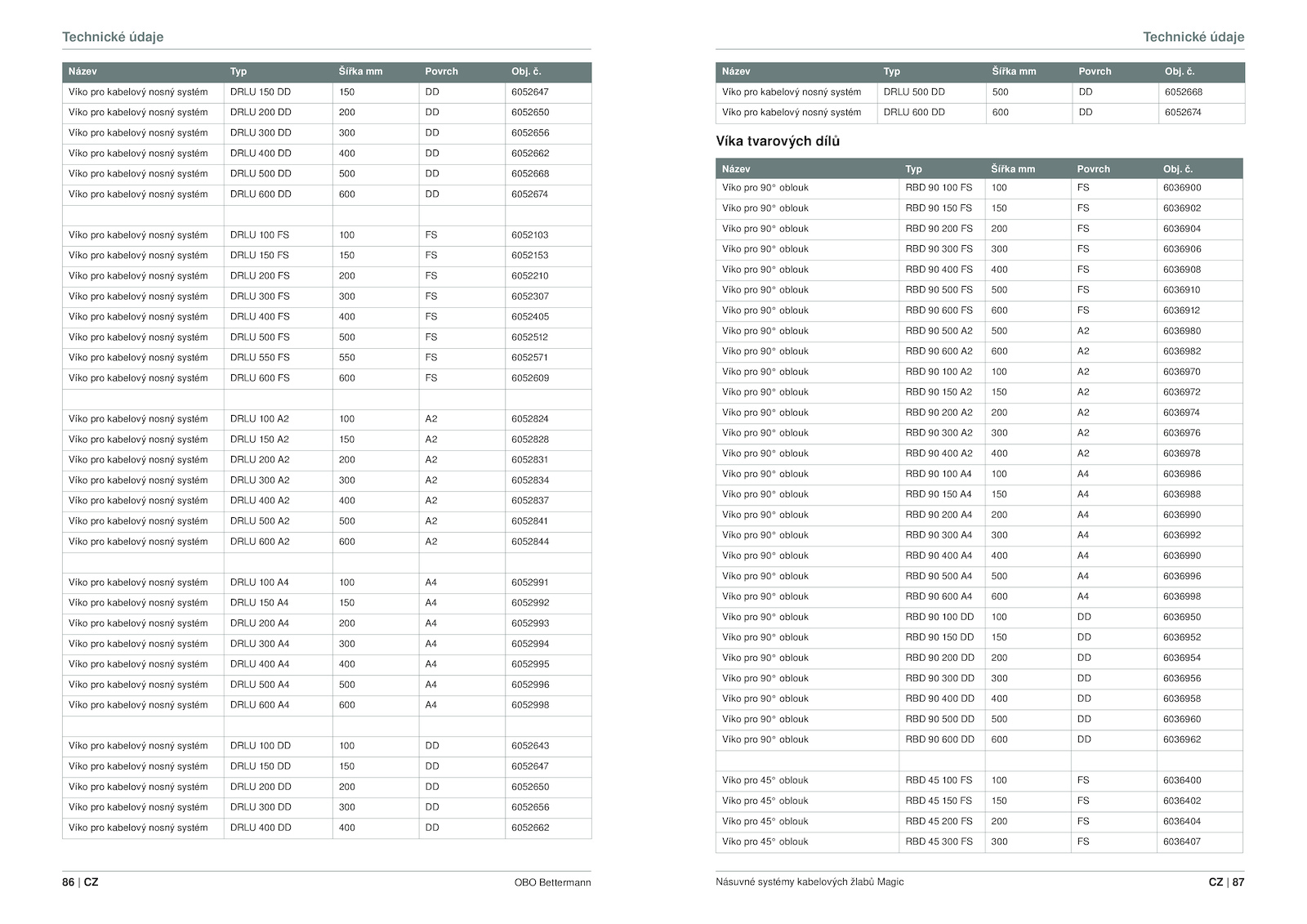 Víko pro 90° oblouk RBD 100 100 6036900 Víko pro 90° oblouk RBD 150 150 6036902 Víko pro 90° oblouk RBD 200 200 6036904 Víko pro 90° oblouk RBD 300 300 6036906 Víko pro 90° oblouk RBD 400 400 6036908 Víko pro 90° oblouk RBD 500 500 6036910 Víko pro 90° oblouk RBD 600 600 6036912 Víko pro 90° oblouk RBD 500 500 6036980 Víko pro 90° oblouk RBD 600 600 6036982 Víko pro 90° oblouk RBD 100 100 6036970 Víko pro 90° oblouk RBD 150 150 6036972 Víko pro 90° oblouk RBD 200 200 6036974 Víko pro 90° oblouk RBD 300 300 6036976 Víko pro 90° oblouk RBD 400 400 6036978 Víko pro 90° oblouk RBD 100 100 6036986 Víko pro 90° oblouk RBD 150 150 6036988 Víko pro 90° oblouk RBD 200 200 6036990 Víko pro 90° oblouk RBD 300 300 6036992 Víko pro 90° oblouk RBD 400 400 6036990 Víko pro 90° oblouk RBD 500 500 6036996 Víko pro 90° oblouk RBD 600 600 6036998 Víko pro 90° oblouk RBD 100 100 6036950 Víko pro 90° oblouk RBD 150 150 6036952 Víko pro 90° oblouk RBD 200 200 6036954 Víko pro 90° oblouk RBD 300 300 6036956 Víko pro 90° oblouk RBD 400 400 6036958 Víko pro 90° oblouk RBD 500 500 6036960 Víko pro 90° oblouk RBD 600 600 6036962 Víko pro 45° oblouk RBD 100 100 6036400 Víko pro 45° oblouk RBD 150 150 6036402 Víko pro 45° oblouk RBD 200 200 6036404 Víko pro 45° oblouk RBD 300 300 6036407 . Víko pro kabelový nosný systém DRLU 150 150 6052647 Víko pro kabelový nosný systém DRLU 200 200 6052650 Víko pro kabelový nosný systém DRLU 300 300 6052656 Víko pro kabelový nosný systém DRLU 400 400 6052662 Víko pro kabelový nosný systém DRLU 500 500 6052668 Víko pro kabelový nosný systém DRLU 600 600 6052674 Víko pro kabelový nosný systém DRLU 100 100 6052103 Víko pro kabelový nosný systém DRLU 150 150 6052153 Víko pro kabelový nosný systém DRLU 200 200 6052210 Víko pro kabelový nosný systém DRLU 300 300 6052307 Víko pro kabelový nosný systém DRLU 400 400 6052405 Víko pro kabelový nosný systém DRLU 500 500 6052512 Víko pro kabelový nosný systém DRLU 550 550 6052571 Víko pro kabelový nosný systém DRLU 600 600 6052609 Víko pro kabelový nosný systém DRLU 100 100 6052824 Víko pro kabelový nosný systém DRLU 150 150 6052828 Víko pro kabelový nosný systém DRLU 200 200 6052831 Víko pro kabelový nosný systém DRLU 300 300 6052834 Víko pro kabelový nosný systém DRLU 400 400 6052837 Víko pro kabelový nosný systém DRLU 500 500 6052841 Víko pro kabelový nosný systém DRLU 600 600 6052844 Víko pro kabelový nosný systém DRLU 100 100 6052991 Víko pro kabelový nosný systém DRLU 150 150 6052992 Víko pro kabelový nosný systém DRLU 200 200 6052993 Víko pro kabelový nosný systém DRLU 300 300 6052994 Víko pro kabelový nosný systém DRLU 400 400 6052995 Víko pro kabelový nosný systém DRLU 500 500 6052996 Víko pro kabelový nosný systém DRLU 600 600 6052998 Víko pro kabelový nosný systém DRLU 100 100 6052643 Víko pro kabelový nosný systém DRLU 150 150 6052647 Víko pro kabelový nosný systém DRLU 200 200 6052650 Víko pro kabelový nosný systém DRLU 300 300 6052656 Víko pro kabelový nosný systém DRLU 400 400 6052662 CZ 87 Násuvné systémy kabelových žlabů Magic Technické údaje Název Typ Šířka Povrch Obj.Technické údaje 86 OBO Bettermann Název Typ Šířka Povrch Obj. č. Víko pro kabelový nosný systém DRLU 500 500 6052668 Víko pro kabelový nosný systém DRLU 600 600 6052674 Víka tvarových dílů Název Typ Šířka Povrch Obj. č. č