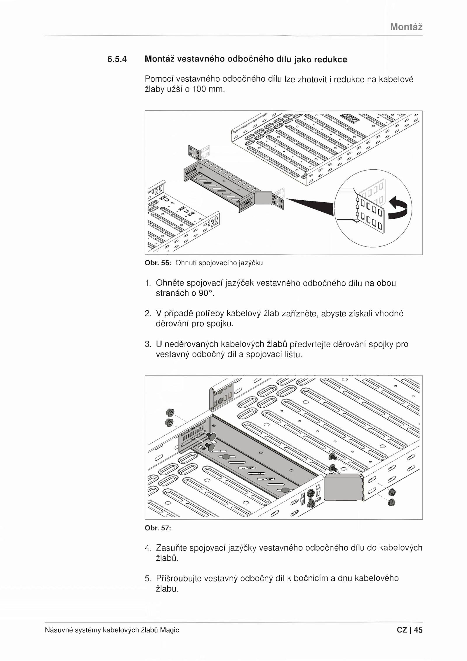 Obr. 57: 4. 5. Přišroubujte vestavný odbočný díl bočnicím dnu kabelového žlabu. 3. Zasuňte spojovací jazýčky vestavného odbočného dílu kabelových žlabů. Ohněte spojovací jazýček vestavného odbočného dílu obou stranách 90°. 56: Ohnutí spojovacího jazýčku 1. případě potřeby kabelový žlab zařízněte, abyste získali vhodné děrování pro spojku. Násuvné systémy kabelových žlabů Magie 45 .5.4 Montáž vestavného odbočného dílu jako redukce Pomocí vestavného odbočného dílu lze zhotovit redukce kabelové žlaby užší 100 mm. 2. Obr. neděrovaných kabelových žlabů předvrtejte děrování spojky pro vestavný odbočný díl spojovací lištu.Montáž 6