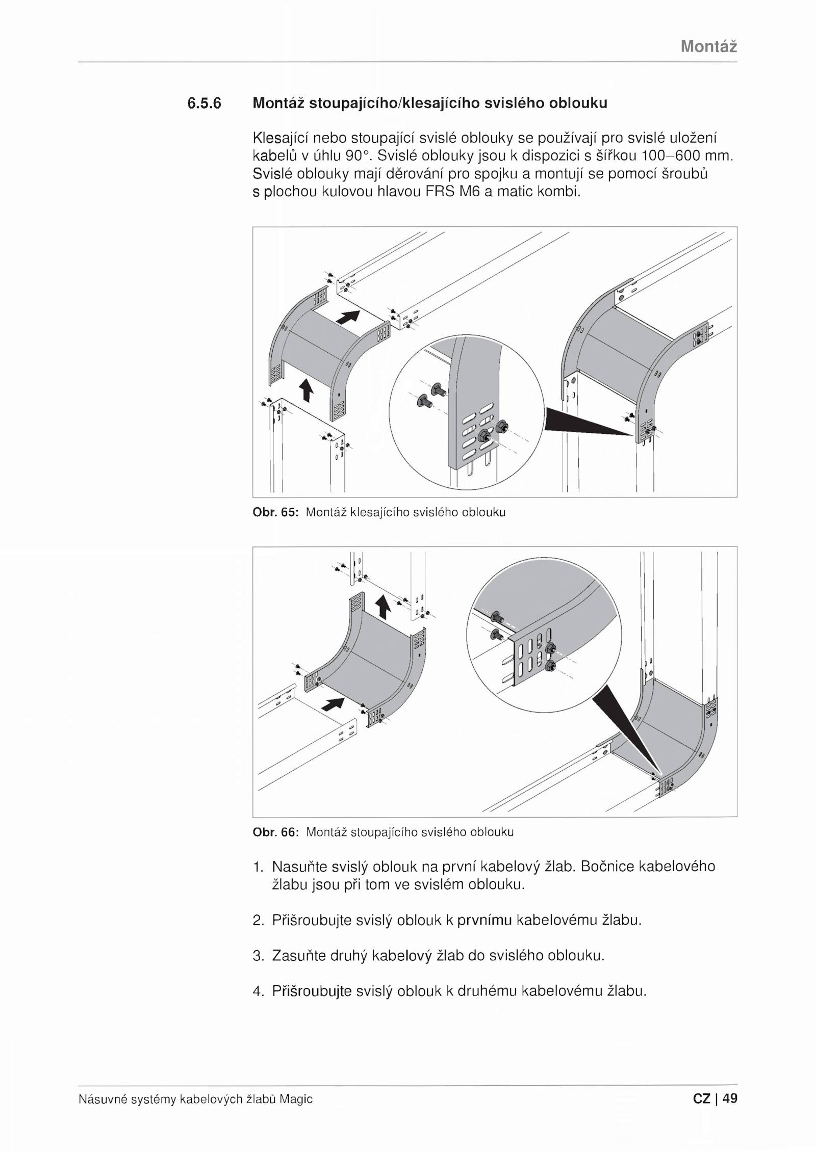 66: Montáž stoupajícího svislého oblouku 1. Násuvné systémy kabelových žlabů Magie 49 .Montáž 6. Bočnice kabelového žlabu jsou při tom svislém oblouku.6 Montáž stoupajícího/klesajícího svislého oblouku Klesající nebo stoupající svislé oblouky používají pro svislé uložení kabelů úhlu 90°. 3. Přišroubujte svislý oblouk prvnímu kabelovému žlabu. Svislé oblouky jsou dispozici šířkou 100-600 mm. 2. Svislé oblouky mají děrování pro spojku montují pomocí šroubů s plochou kulovou hlavou FRS matic kombi. 4. Nasuňte svislý oblouk první kabelový žlab. Zasuňte druhý kabelový žlab svislého oblouku. Obr.5. Přišroubujte svislý oblouk druhému kabelovému žlabu. 65: Montáž klesajícího svislého oblouku Obr