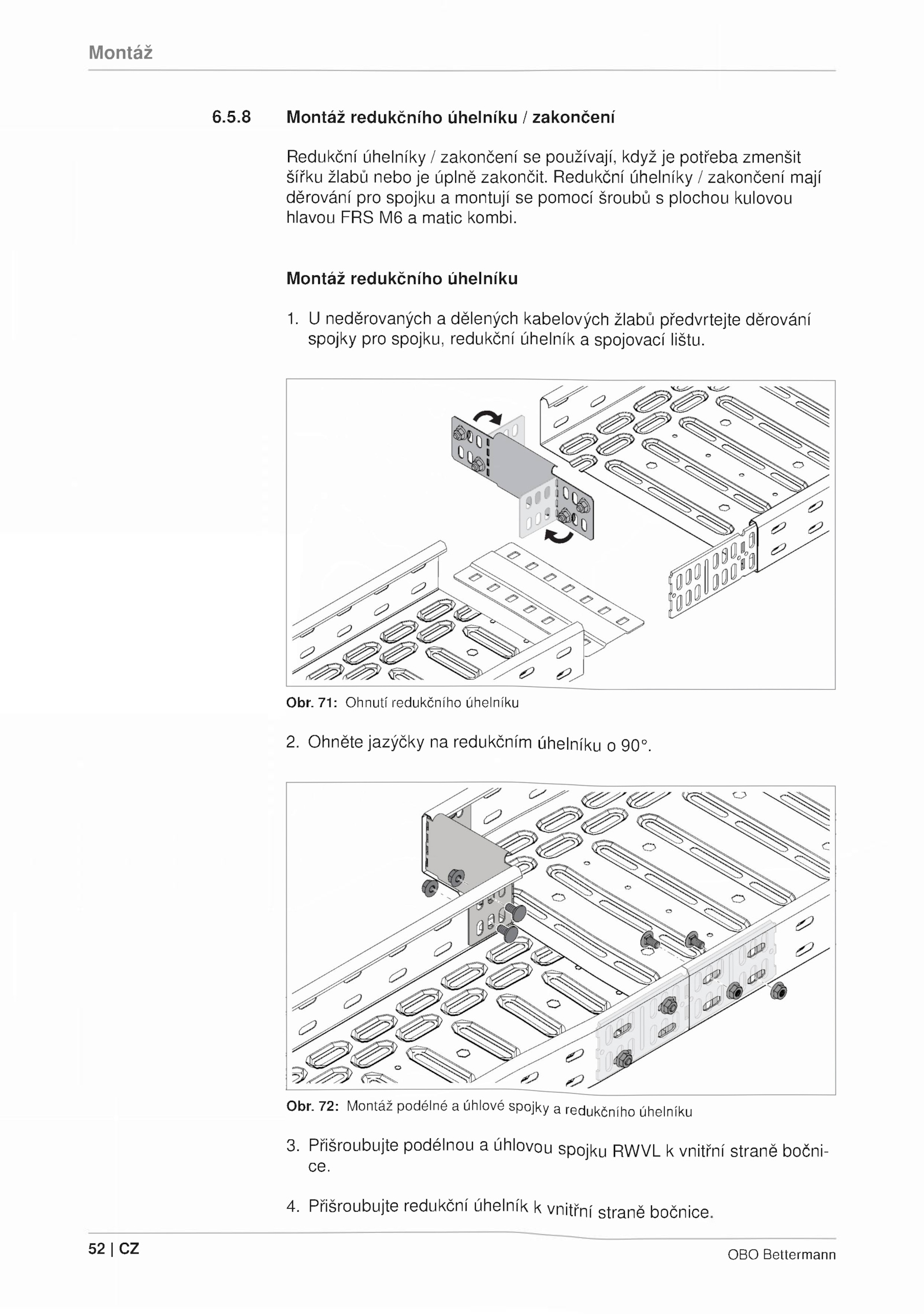 Obr. 72: Montáž podélné úhlové spojky redukčního úhelníku 3. 71: Ohnutí redukčního úhelníku 2.5. Přišroubujte podélnou úhlovou spojku RWVL vnitřní straně bočni ce.8 Montáž redukčního úhelníku zakončení Redukční úhelníky zakončení používají, když potřeba zmenšit šířku žlabů nebo úplně zakončit.Montáž 6. Přišroubujte redukční úhelník vnitřní straně bočnice 52 OBO Bettermann . 4. Obr. neděrovaných dělených kabelových žlabů předvrtejte děrování spojky pro spojku, redukční úhelník spojovací lištu. Montáž redukčního úhelníku 1. Ohněte jazýčky redukčním úhelníku 90°. Redukční úhelníky zakončení mají děrování pro spojku montují pomocí šroubů plochou kulovou hlavou FRS matic kombi