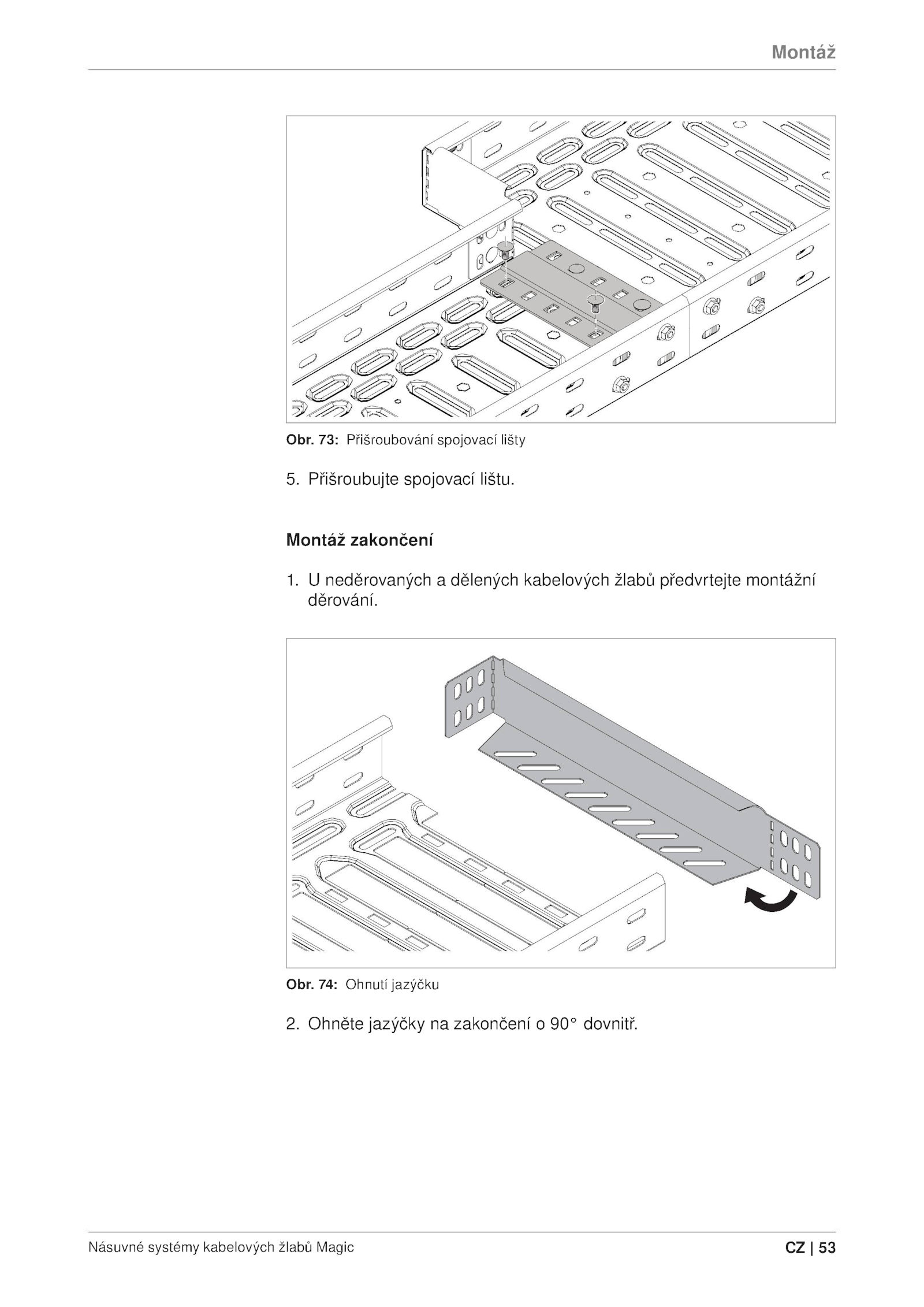 Montáž Obr. Obr. Přišroubujte spojovací lištu. 74: Ohnutí jazýčku 2. Ohněte jazýčky zakončení 90° dovnitř. Násuvné systémy kabelových žlabů Magie 53 . neděrovaných dělených kabelových žlabů předvrtejte montážní děrování. Montáž zakončení 1. 73: Přišroubování spojovací lišty 5