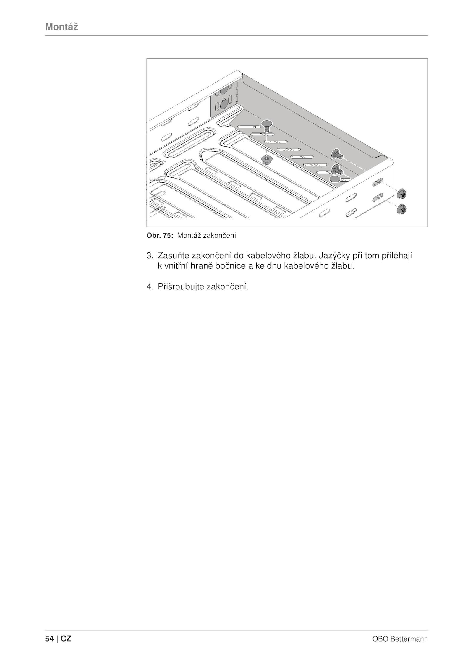 4. 54 OBO Bettermann . Přišroubujte zakončení.Montáž Obr. 75: Montáž zakončení 3. Jazýčky při tom přiléhají k vnitřní hraně bočnice dnu kabelového žlabu. Zasuňte zakončení kabelového žlabu