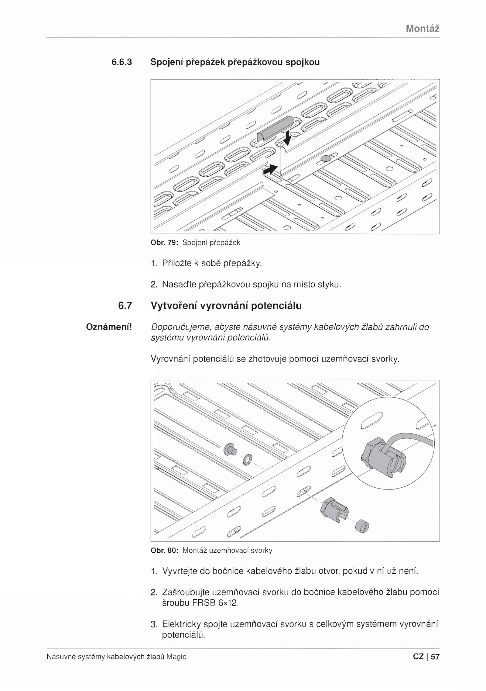 Přiložte sobě přepážky. 2. 6. 2. Nasaďte přepážkovou spojku místo styku. 79: Spojení přepážek 1.Montáž 6. 80: Montáž uzemňovací svorky 1.7 Vytvoření vyrovnání potenciálu Oznámení! Doporučujeme, abyste násuvné systémy kabelových žlabů zahrnuli do systému vyrovnánípotenciálů. Vyvrtejte bočnice kabelového žlabu otvor, pokud není. Vyrovnání potenciálů zhotovuje pomocí uzemňovací svorky.3 Spojení přepážek přepážkovou spojkou Obr. Zašroubujte uzemňovací svorku bočnice kabelového žlabu pomocí šroubu FRSB 6x12. Násuvné systémy kabelových žlabů Magie 57 . Elektricky spojte uzemňovací svorku celkovým systémem vyrovnání potenciálů.6. 3. Obr