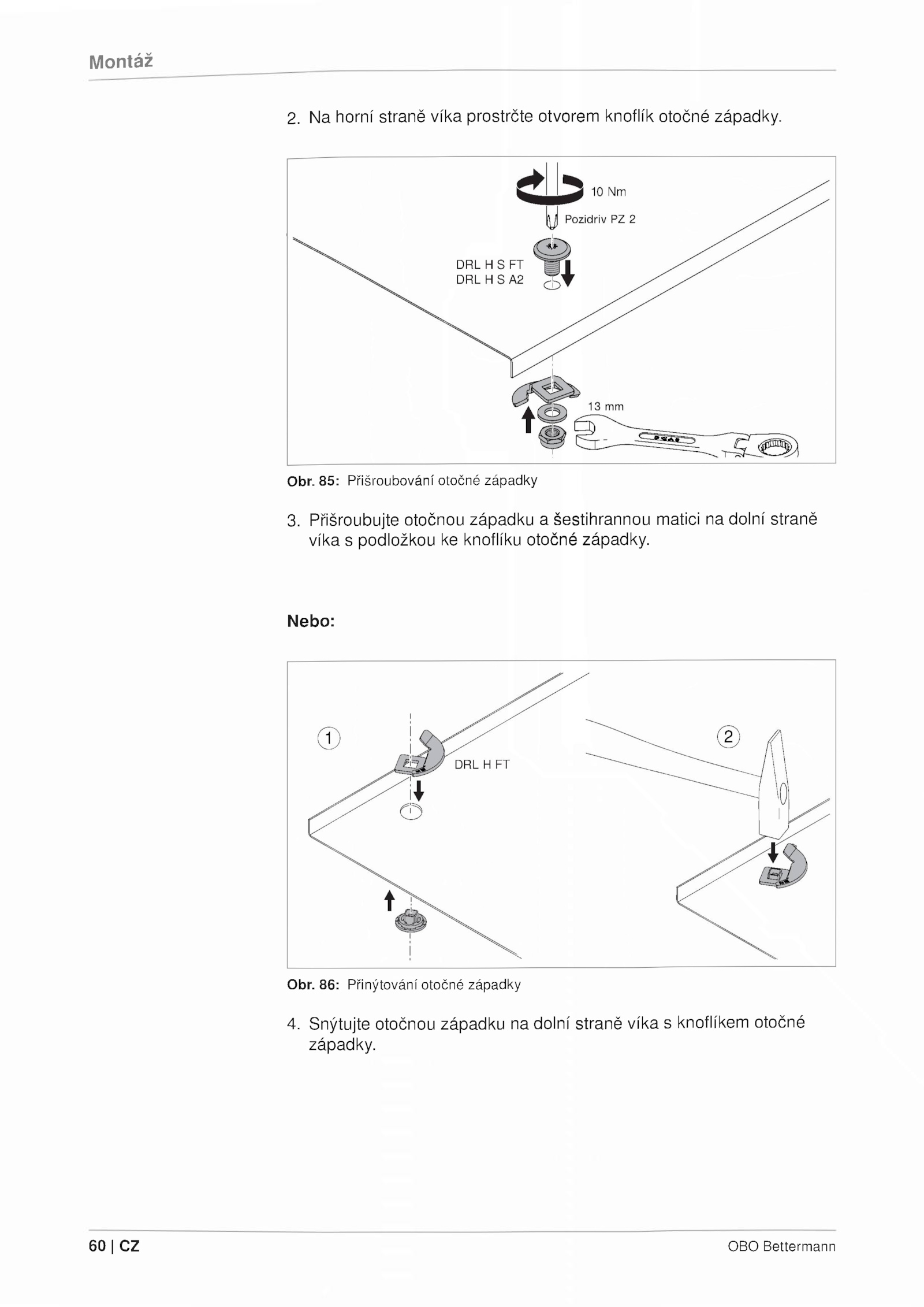 86: Přinýtování otočné západky 4. Snýtujte otočnou západku dolní straně víka knoflíkem otočné západky. 60 OBO Bettermann . Obr.Montáž 2. horní straně víka prostrčte otvorem knoflík otočné západky. Nebo: Obr. 85: Přišroubování otočné západky 3. Přišroubujte otočnou západku šestihrannou matici dolní straně víka podložkou knoflíku otočné západky