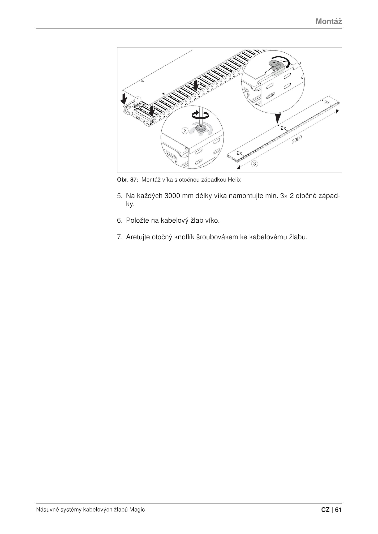 Položte kabelový žlab víko. 87: Montáž víka otočnou západkou Helix 5. Aretujte otočný knoflík šroubovákem kabelovému žlabu. každých 3000 délky víka namontujte min. 6.Montáž Obr. Násuvné systémy kabelových žlabů Magie 61 . 7. otočné západ ky