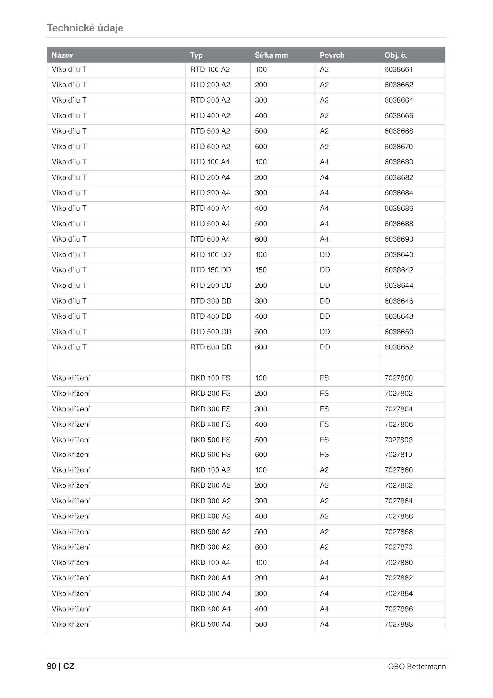 Víko dílu RTD 100 100 6038661 Víko dílu RTD 200 200 6038662 Víko dílu RTD 300 300 6038664 Víko dílu RTD 400 400 6038666 Víko dílu RTD 500 500 6038668 Víko dílu RTD 600 600 6038670 Víko dílu RTD 100 100 6038680 Víko dílu RTD 200 200 6038682 Víko dílu RTD 300 300 6038684 Víko dílu RTD 400 400 6038686 Víko dílu RTD 500 500 6038688 Víko dílu RTD 600 600 6038690 Víko dílu RTD 100 100 6038640 Víko dílu RTD 150 150 6038642 Víko dílu RTD 200 200 6038644 Víko dílu RTD 300 300 6038646 Víko dílu RTD 400 400 6038648 Víko dílu RTD 500 500 6038650 Víko dílu RTD 600 600 6038652 Víko křížení RKD 100 100 7027800 Víko křížení RKD 200 200 7027802 Víko křížení RKD 300 300 7027804 Víko křížení RKD 400 400 7027806 Víko křížení RKD 500 500 7027808 Víko křížení RKD 600 600 7027810 Víko křížení RKD 100 100 7027860 Víko křížení RKD 200 200 7027862 Víko křížení RKD 300 300 7027864 Víko křížení RKD 400 400 7027866 Víko křížení RKD 500 500 7027868 Víko křížení RKD 600 600 7027870 Víko křížení RKD 100 100 7027880 Víko křížení RKD 200 200 7027882 Víko křížení RKD 300 300 7027884 Víko křížení RKD 400 400 7027886 Víko křížení RKD 500 500 7027888 90 OBO Bettermann . č.Technické údaje Název Typ Šířka Povrch Obj