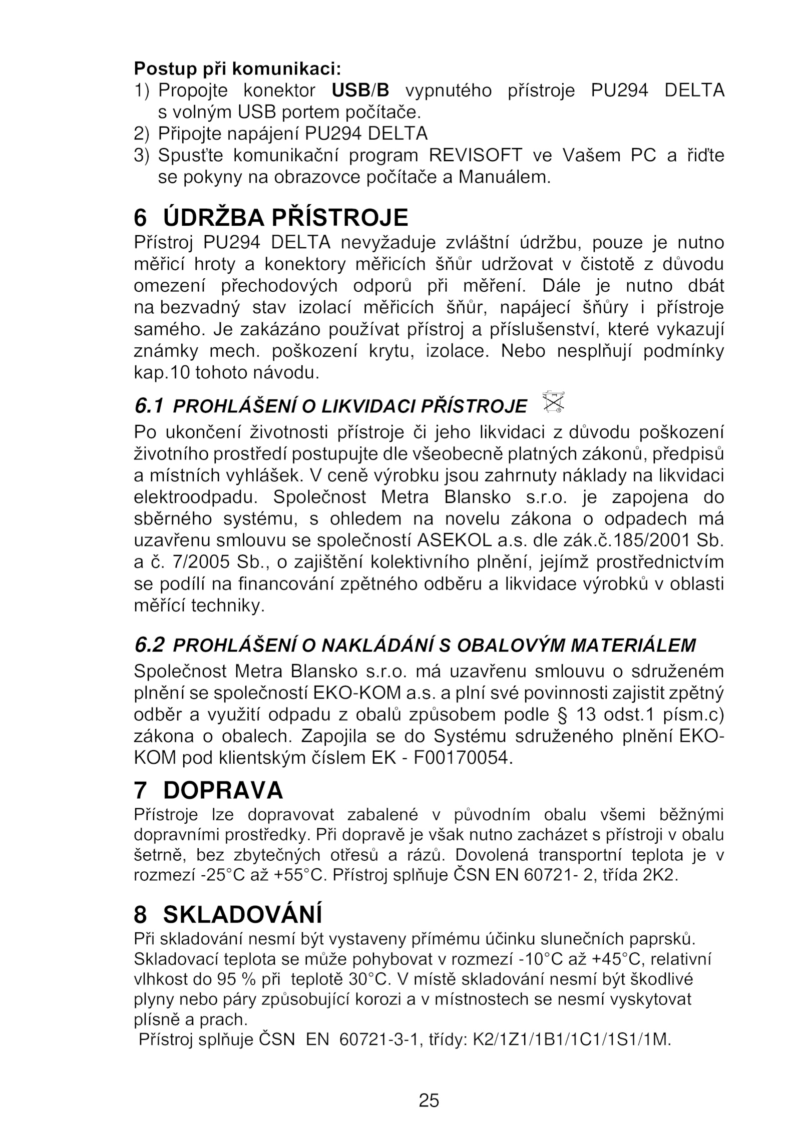 kap.185/2001 Sb.r. dle zák.o. Přístroj splňuje ČSN 60721- třída 2K2. Při dopravě však nutno zacházet přístroji obalu