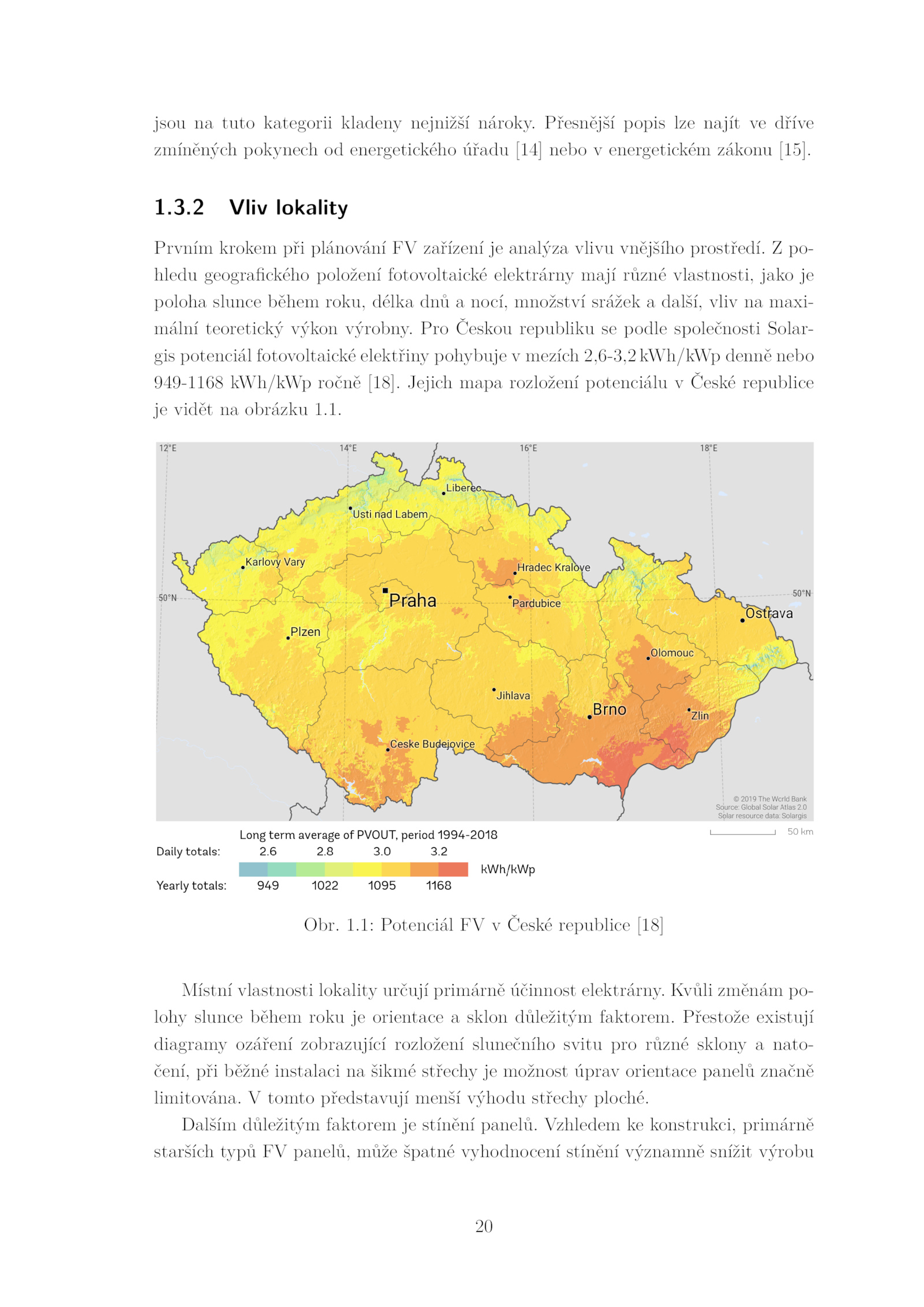 gis potenciál fotovoltaické elektřiny pohybuje mezích 2,6-3,2 kWh/kWp denně nebo