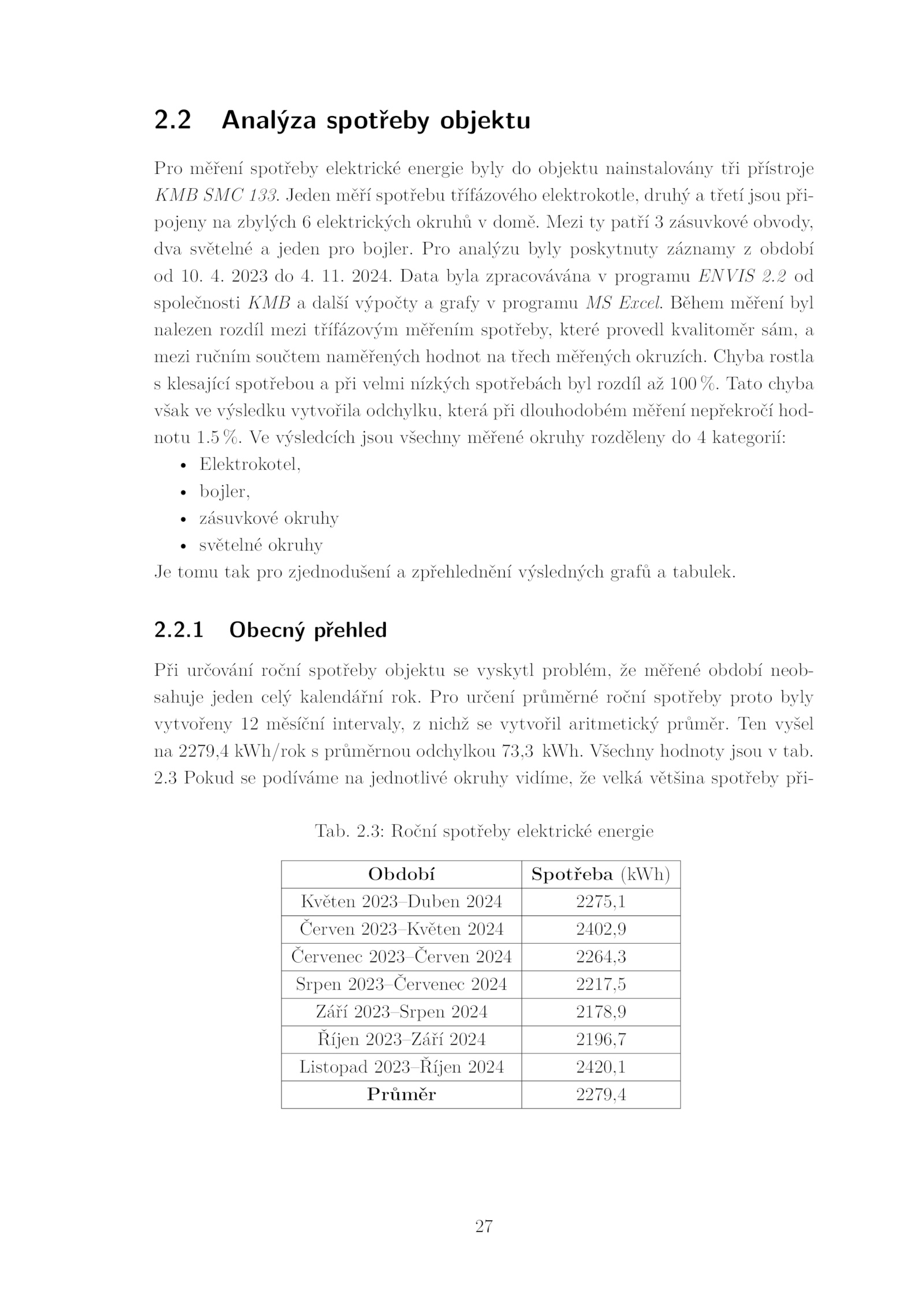na 2279,4 kWh/rok průměrnou odchylkou 73,3 kWh.2.1 Obecný přehled