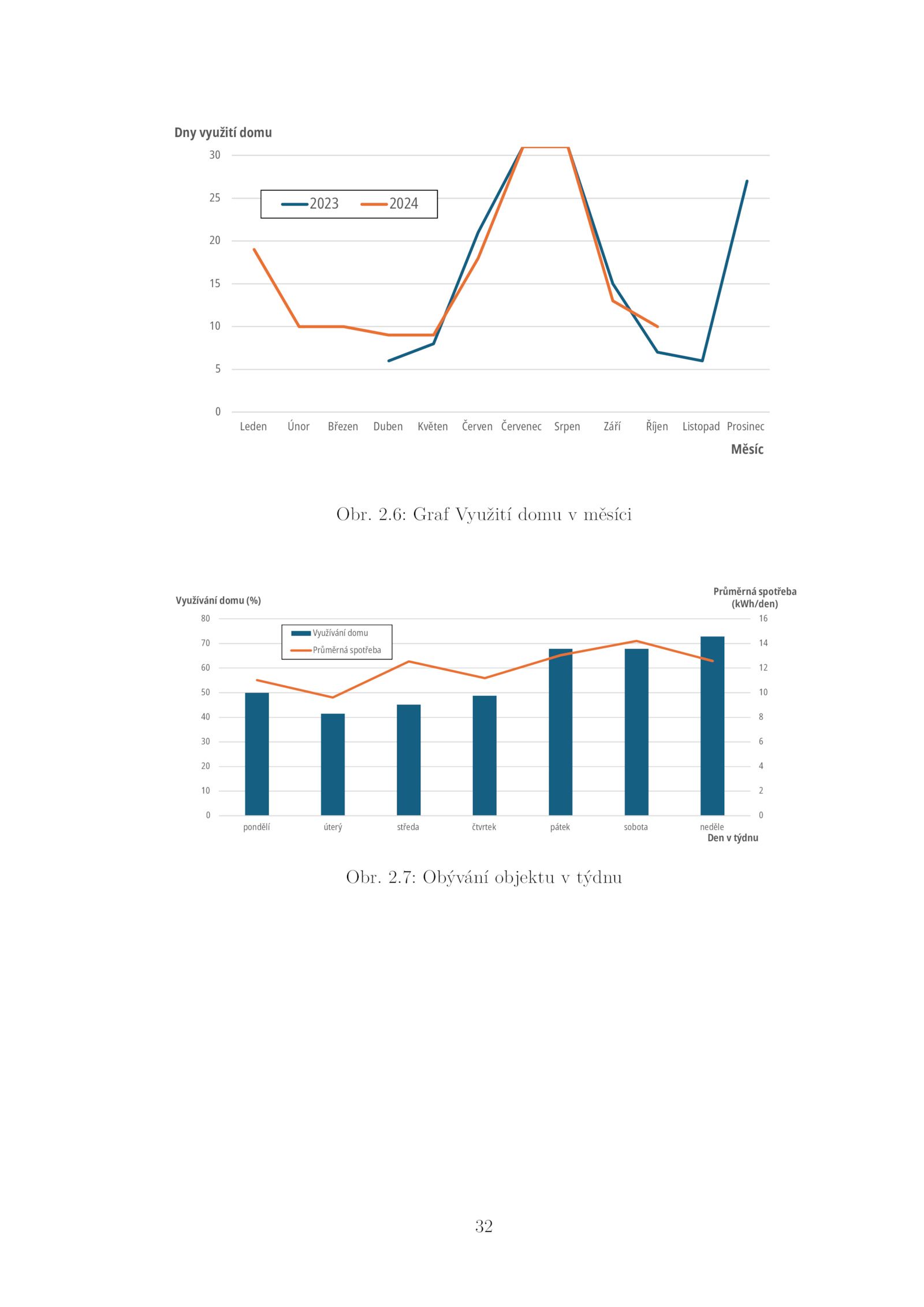7: Obývání objektu týdnu 32 . 2. 2.0 5 10 15 20 25 30 Leden Únor Březen Duben Květen Červen Červenec Srpen Září Říjen Listopad Prosinec Dny využití domu Měsíc 2023 2024 Obr.6: Graf Využití domu měsíci 0 2 4 6 8 10 12 14 16 0 10 20 30 40 50 60 70 80 pondělí úterý středa čtvrtek pátek sobota neděle Průměrná spotřeba (kWh/den) Využívání domu (%) Den týdnu Využívání domu Průměrná spotřeba Obr