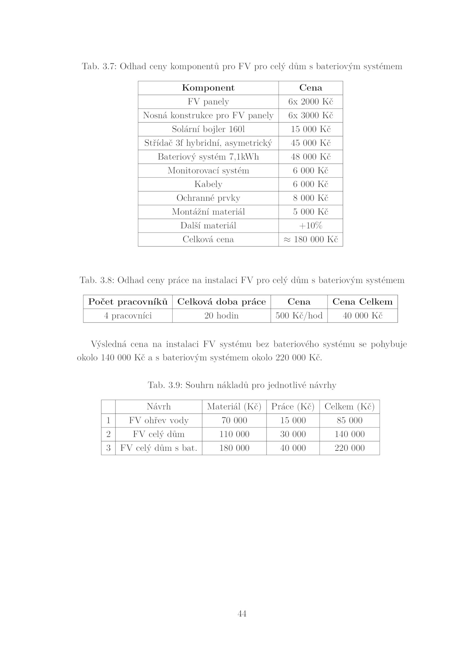 Tab. 3.7: Odhad ceny komponentů pro pro celý dům bateriovým systémem