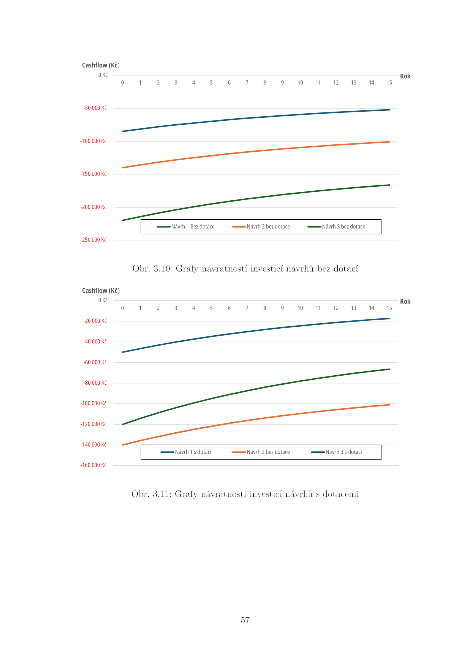 11: Grafy návratností investicí návrhů dotacemi 57 . 3. 3.-250 000 Kč -200 000 Kč -150 000 Kč -100 000 Kč -50 000 Kč 0 Kč 0 15 Cashflow (Kč) Rok Návrh Bez dotace Návrh bez dotace Návrh bez dotace Obr.10: Grafy návratností investicí návrhů bez dotací -160 000 Kč -140 000 Kč -120 000 Kč -100 000 Kč -80 000 Kč -60 000 Kč -40 000 Kč -20 000 Kč 0 Kč 0 15 Cashflow (Kč) Rok Návrh dotací Návrh bez dotace Návrh dotací Obr