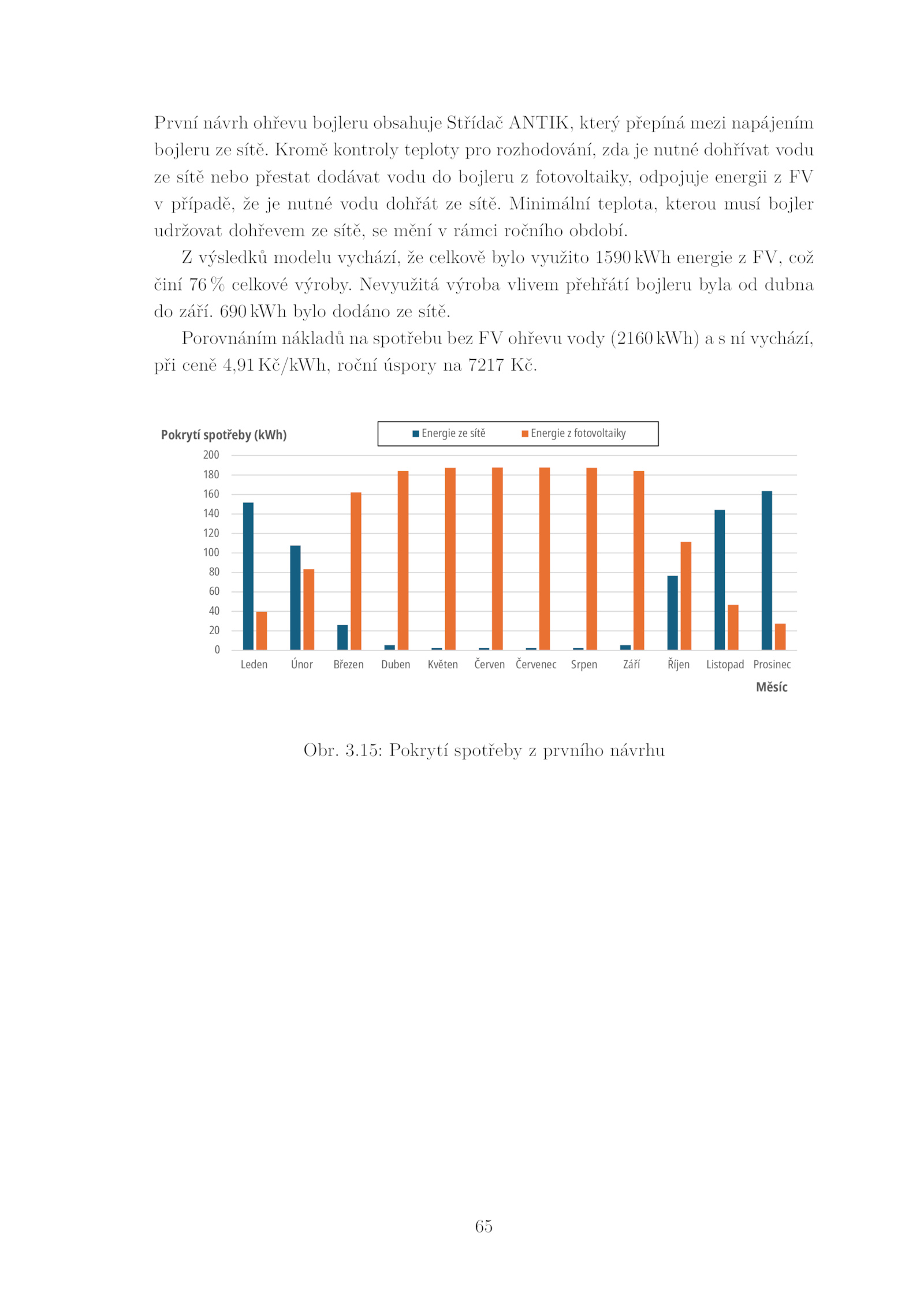 při ceně 4,91 Kč/kWh, roční úspory 7217 Kč. 690 kWh bylo dodáno sítě. Minimální teplota, kterou musí bojler