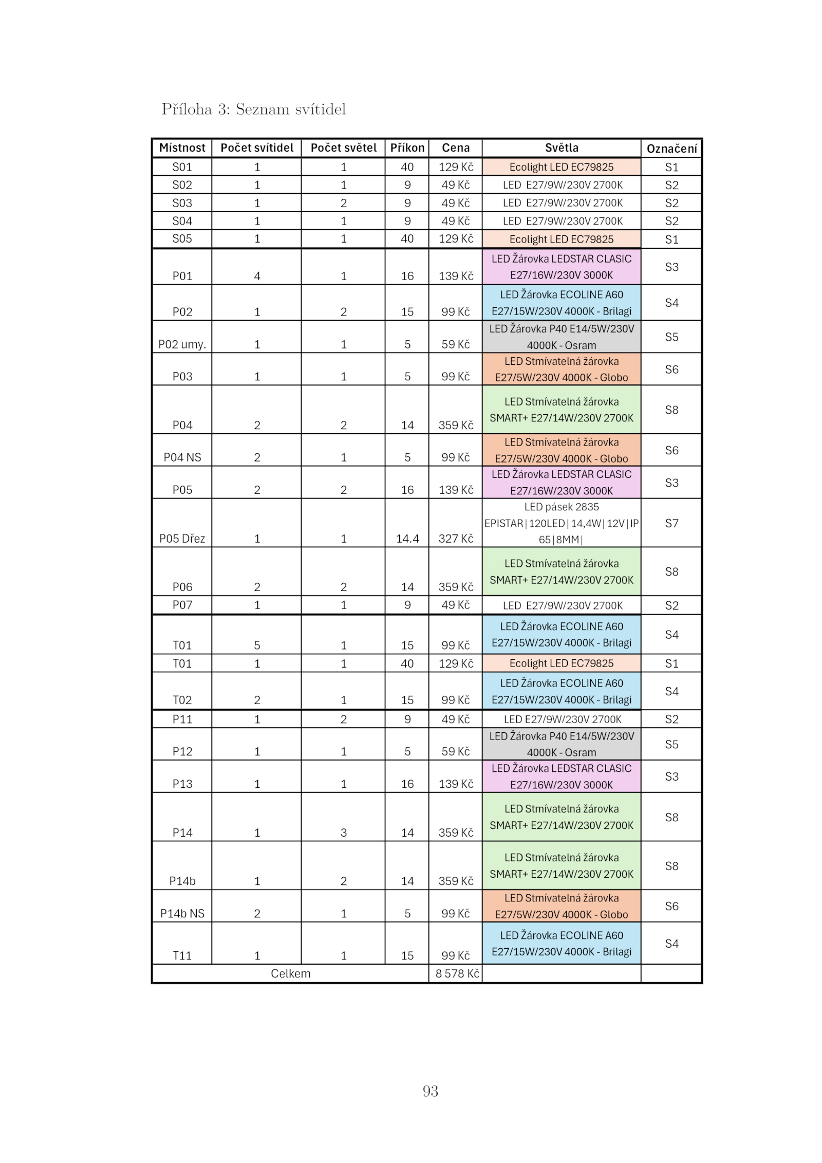 Příloha Seznam svítidel Místnost Počet svítidel Počet světel Příkon Cena Světla Označení S01 129 Ecolight LED EC79825 S1 S02 LED E27/9W/230V 2700K S2 S03 LED E27/9W/230V 2700K S2 S04 LED E27/9W/230V 2700K S2 S05 129 Ecolight LED EC79825 S1 P01 139 Kč LED Žárovka LEDSTAR CLASIC E27/16W/230V 3000K S3 P02 Kč LED Žárovka ECOLINE A60 E27/15W/230V 4000K Brilagi S4 P02 umy.4 327 Kč LED pásek 2835 EPISTAR|120LED|14,4W|12V|IP 65|8MM| S7 P06 359 Kč LED Stmívatelná žárovka SMART+ E27/14W/230V 2700K S8 P07 LED E27/9W/230V 2700K S2 T01 Kč LED Žárovka ECOLINE A60 E27/15W/230V 4000K Brilagi S4 T01 129 Ecolight LED EC79825 S1 T02 Kč LED Žárovka ECOLINE A60 E27/15W/230V 4000K Brilagi S4 P11 LED E27/9W/230V 2700K S2 P12 Kč LED Žárovka P40 E14/5W/230V 4000K Osram S5 P13 139 Kč LED Žárovka LEDSTAR CLASIC E27/16W/230V 3000K S3 P14 359 Kč LED Stmívatelná žárovka SMART+ E27/14W/230V 2700K S8 P14b 359 Kč LED Stmívatelná žárovka SMART+ E27/14W/230V 2700K S8 P14b Kč LED Stmívatelná žárovka E27/5W/230V 4000K Globo S6 T11 Kč LED Žárovka ECOLINE A60 E27/15W/230V 4000K Brilagi S4 8 578 Kč Celkem 93 . Kč LED Žárovka P40 E14/5W/230V 4000K Osram S5 P03 Kč LED Stmívatelná žárovka E27/5W/230V 4000K Globo S6 P04 359 Kč LED Stmívatelná žárovka SMART+ E27/14W/230V 2700K S8 P04 Kč LED Stmívatelná žárovka E27/5W/230V 4000K Globo S6 P05 139 Kč LED Žárovka LEDSTAR CLASIC E27/16W/230V 3000K S3 P05 Dřez 14