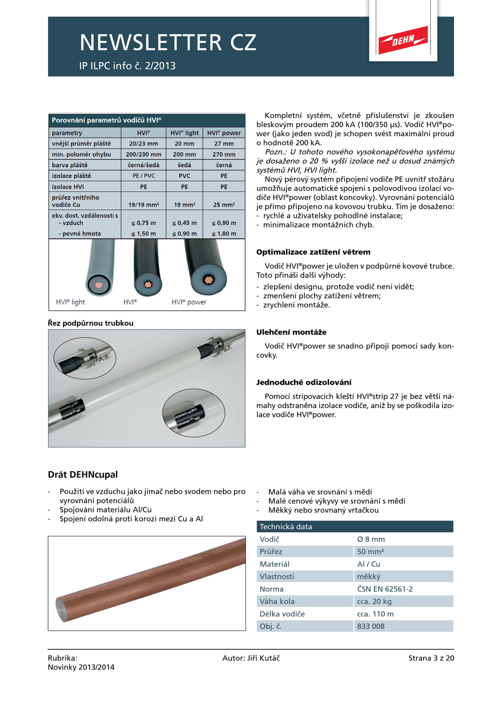 833 008 - Malá váha srovnání mědí - Malé cenové výkyvy srovnání mědí - Měkký nebo srovnaný vrtačkou PE PVC . Toto přináší další výhody: - zlepšení designu, protože vodič není vidět; - zmenšení plochy zatížení větrem; - zrychlení montáže.: tohoto nového vysokonapěťového systému je dosaženo vyšší izolace než dosud známých systémů HVI, HVI light. 110 m Obj. Řez podpůrnou trubkou Drát DEHNcupal - Použití vzduchu jako jímač nebo svodem nebo pro vyrovnání potenciálů - Spojování materiálu Al/Cu - Spojení odolná proti korozi mezi Al Technická data Vodič mm Průřez mm² Materiál Cu Vlastnosti měkký Norma ČSN 62561-2 Váha kola cca. Optimalizace zatížení větrem Vodič HVI® power uložen podpůrné kovové trubce. Nový pérový systém připojení vodiče uvnitř stožáru umožňuje automatické spojení polovodivou izolací vo- diče HVI® power (oblast koncovky). Ulehčení montáže Vodič HVI® power snadno připojí pomocí sady kon- covky.Strana 20Rubrika: Novinky 2013/2014 Autor: Jiří Kutáč NEWSLETTER CZ IP ILPC info 2/2013 Kompletní systém, včetně příslušenství zkoušen bleskovým proudem 200 (100/350 μs). Jednoduché odizolování Pomocí stripovacích kleští HVI® strip bez větší ná- mahy odstraněna izolace vodiče, aniž poškodila izo- lace vodiče HVI® power. Vyrovnání potenciálů je přímo připojeno kovovou trubku. Pozn. Tím dosaženo: - rychlé uživatelsky pohodlné instalace; - minimalizace montážních chyb. kg Délka vodiče cca. Vodič HVI® po- wer (jako jeden svod) schopen svést maximální proud o hodnotě 200 kA