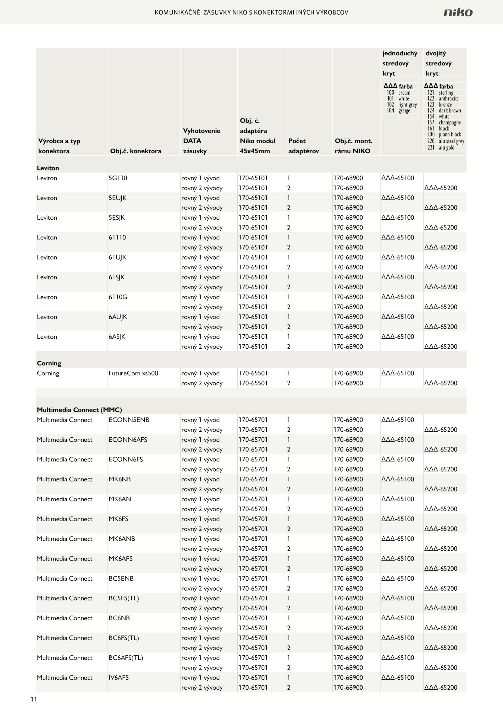 adaptéra Niko modul 45x45mm Počet adaptérov Obj.110 KOMUNIKAČNÉ ZÁSUVKY NIKO KONEKTORMI INÝCH VÝROBCOV Výrobca typ konektora Obj. rámu NIKO jednoduchý stredový kryt dvojitý stredový kryt ΔΔΔ farba ΔΔΔ farba 100 cream 121 sterling 101 white 122 anthracite 102 light grey 123 bronze 104 greige 124 dark brown 154 white 157 champagne 161 black 200 piano black 220 alu steel grey 221 alu gold Leviton Leviton 5G110 rovný vývod 170-65101 170-68900 ΔΔΔ-65100 rovný vývody 170-65101 170-68900 ΔΔΔ-65200 Leviton 5EUJK rovný vývod 170-65101 170-68900 ΔΔΔ-65100 rovný vývody 170-65101 170-68900 ΔΔΔ-65200 Leviton 5ESJK rovný vývod 170-65101 170-68900 ΔΔΔ-65100 rovný vývody 170-65101 170-68900 ΔΔΔ-65200 Leviton 61110 rovný vývod 170-65101 170-68900 ΔΔΔ-65100 rovný vývody 170-65101 170-68900 ΔΔΔ-65200 Leviton 61UJK rovný vývod 170-65101 170-68900 ΔΔΔ-65100 rovný vývody 170-65101 170-68900 ΔΔΔ-65200 Leviton 61SJK rovný vývod 170-65101 170-68900 ΔΔΔ-65100 rovný vývody 170-65101 170-68900 ΔΔΔ-65200 Leviton 6110G rovný vývod 170-65101 170-68900 ΔΔΔ-65100 rovný vývody 170-65101 170-68900 ΔΔΔ-65200 Leviton 6AUJK rovný vývod 170-65101 170-68900 ΔΔΔ-65100 rovný vývody 170-65101 170-68900 ΔΔΔ-65200 Leviton 6ASJK rovný vývod 170-65101 170-68900 ΔΔΔ-65100 rovný vývody 170-65101 170-68900 ΔΔΔ-65200 Corning Corning FutureCom xs500 rovný vývod 170-65501 170-68900 ΔΔΔ-65100 rovný vývody 170-65501 170-68900 ΔΔΔ-65200 Multimedia Connect (MMC) Multimedia Connect ECONN5ENB rovný vývod 170-65701 170-68900 ΔΔΔ-65100 rovný vývody 170-65701 170-68900 ΔΔΔ-65200 Multimedia Connect ECONN6AFS rovný vývod 170-65701 170-68900 ΔΔΔ-65100 rovný vývody 170-65701 170-68900 ΔΔΔ-65200 Multimedia Connect ECONN6FS rovný vývod 170-65701 170-68900 ΔΔΔ-65100 rovný vývody 170-65701 170-68900 ΔΔΔ-65200 Multimedia Connect MK6NB rovný vývod 170-65701 170-68900 ΔΔΔ-65100 rovný vývody 170-65701 170-68900 ΔΔΔ-65200 Multimedia Connect MK6AN rovný vývod 170-65701 170-68900 ΔΔΔ-65100 rovný vývody 170-65701 170-68900 ΔΔΔ-65200 Multimedia Connect MK6FS rovný vývod 170-65701 170-68900 ΔΔΔ-65100 rovný vývody 170-65701 170-68900 ΔΔΔ-65200 Multimedia Connect MK6ANB rovný vývod 170-65701 170-68900 ΔΔΔ-65100 rovný vývody 170-65701 170-68900 ΔΔΔ-65200 Multimedia Connect MK6AFS rovný vývod 170-65701 170-68900 ΔΔΔ-65100 rovný vývody 170-65701 170-68900 ΔΔΔ-65200 Multimedia Connect BC5ENB rovný vývod 170-65701 170-68900 ΔΔΔ-65100 rovný vývody 170-65701 170-68900 ΔΔΔ-65200 Multimedia Connect BC5FS(TL) rovný vývod 170-65701 170-68900 ΔΔΔ-65100 rovný vývody 170-65701 170-68900 ΔΔΔ-65200 Multimedia Connect BC6NB rovný vývod 170-65701 170-68900 ΔΔΔ-65100 rovný vývody 170-65701 170-68900 ΔΔΔ-65200 Multimedia Connect BC6FS(TL) rovný vývod 170-65701 170-68900 ΔΔΔ-65100 rovný vývody 170-65701 170-68900 ΔΔΔ-65200 Multimedia Connect BC6AFS(TL) rovný vývod 170-65701 170-68900 ΔΔΔ-65100 rovný vývody 170-65701 170-68900 ΔΔΔ-65200 Multimedia Connect IV6AFS rovný vývod 170-65701 170-68900 ΔΔΔ-65100 rovný vývody 170-65701 170-68900 ΔΔΔ-65200 .č. č. konektora Vyhotovenie DATA zásuvky Obj.č. mont