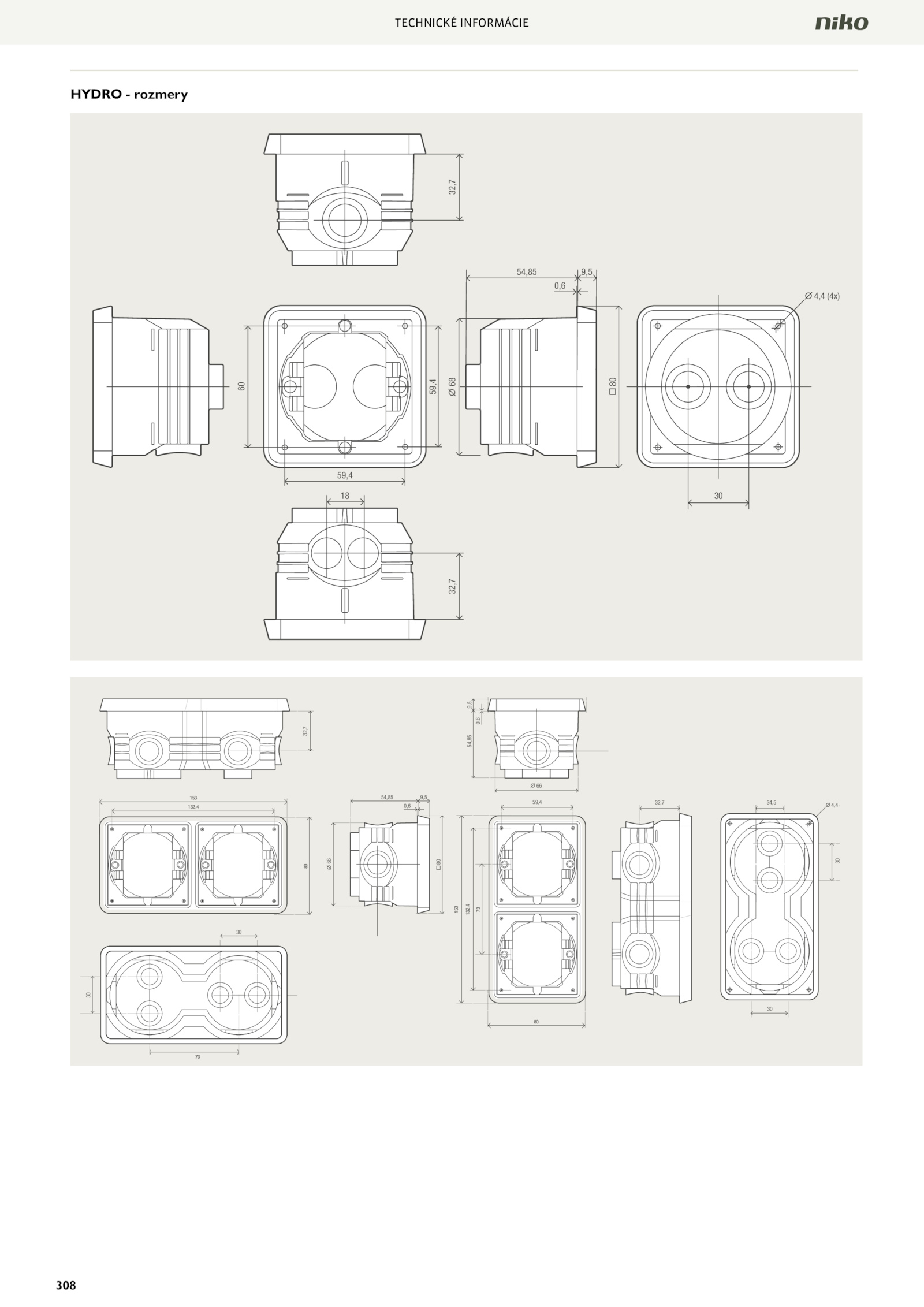 Technické informácie 308 Hydro rozmery 32,7 32,7 60 59,4 59,4 18 30 80 68 54,85 0,6 9,5 4,4 (4x) 80 60 153 132,4 73 80 32,7 59,4 153 132,4 73 32,7 32,7 32,7 34,5 54,85 0,6 9,5 66 80 54,85 0,6 9,5 80 66 30 30 30 4,4 (4x) 30