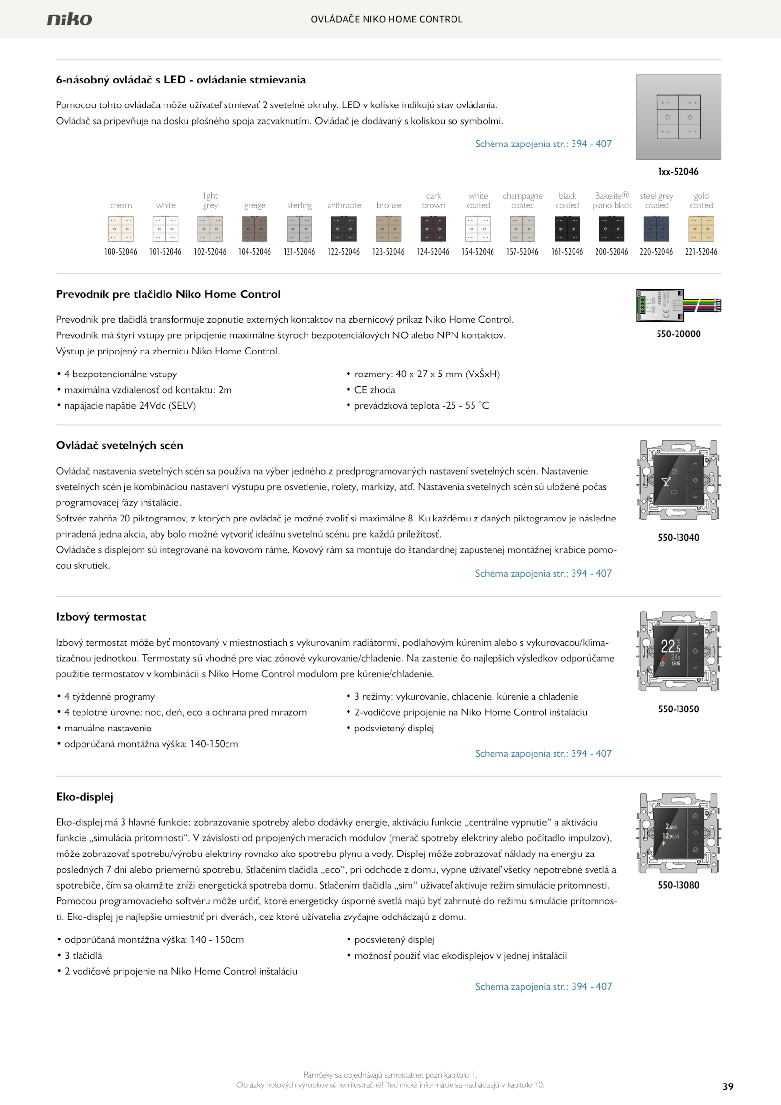 použitie termostatov kombinácii Niko Home Control modulom pre kúrenie/chladenie. Ovládač dodávaný kolískou symbolmi. Stlačením tlačidla „eco“, pri odchode domu, vypne užívateľ všetky nepotrebné svetlá a