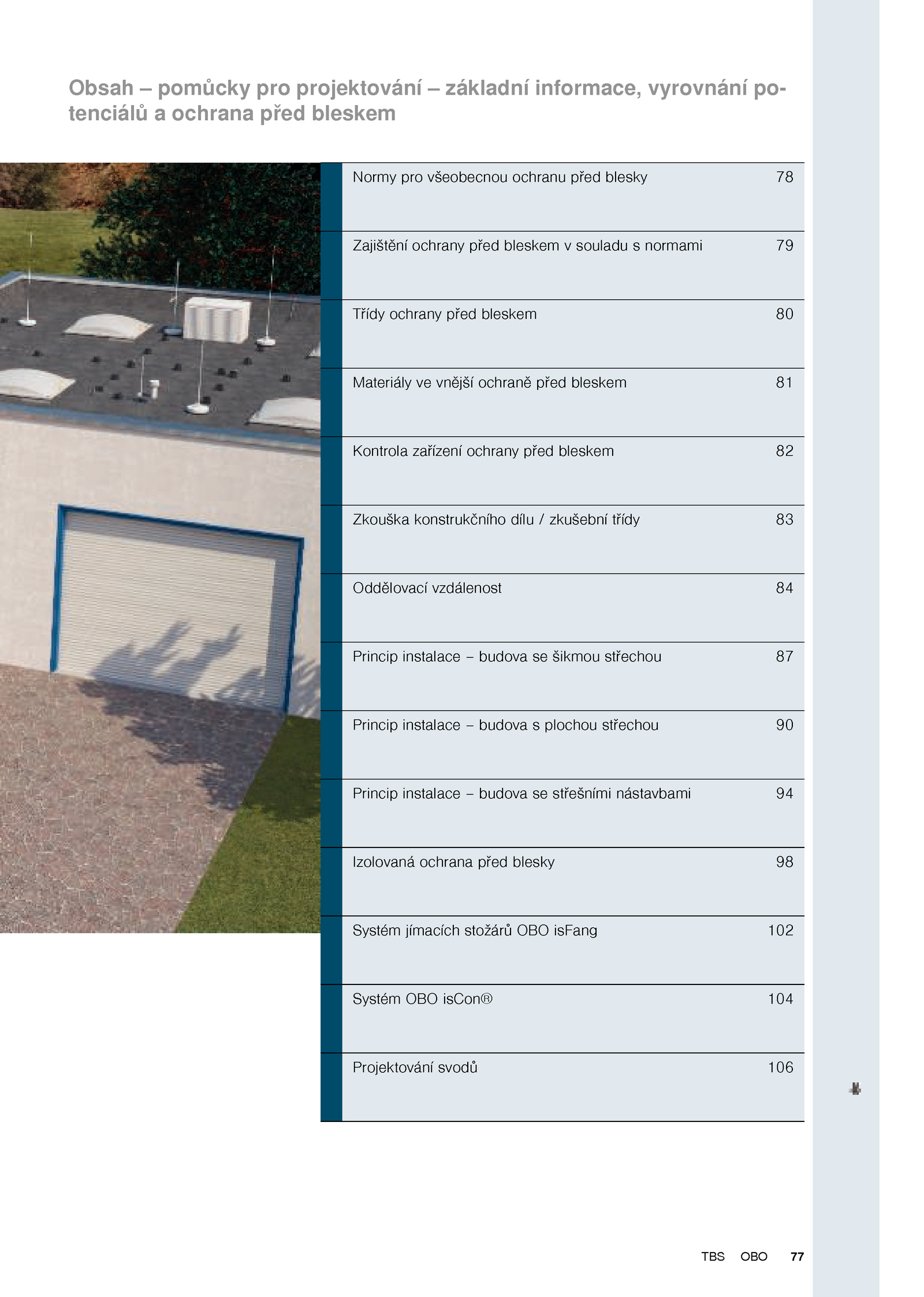 Obsah pomůcky pro projektování základní informace, vyrovnání potenciálů ochrana před bleskem Normy pro všeobecnou ochranu před blesky 78 Zajištění ochrany před bleskem souladu normami 79 Třídy ochrany před bleskem 80 Materiály vnější ochraně před bleskem 81 Kontrola zařízení ochrany před bleskem 82 Zkouška konstrukčního dílu zkušební třídy 83 Oddělovací vzdálenost 84 Princip instalace budova šikmou střechou 87 Princip instalace budova plochou střechou 90 Princip instalace budova střešními nástavbami 94 Izolovaná ochrana před blesky 98 Systém jímacích stožárů OBO isFang 102 Systém OBO isCon® 104 Projektování svodů 106 TBS OBO 77