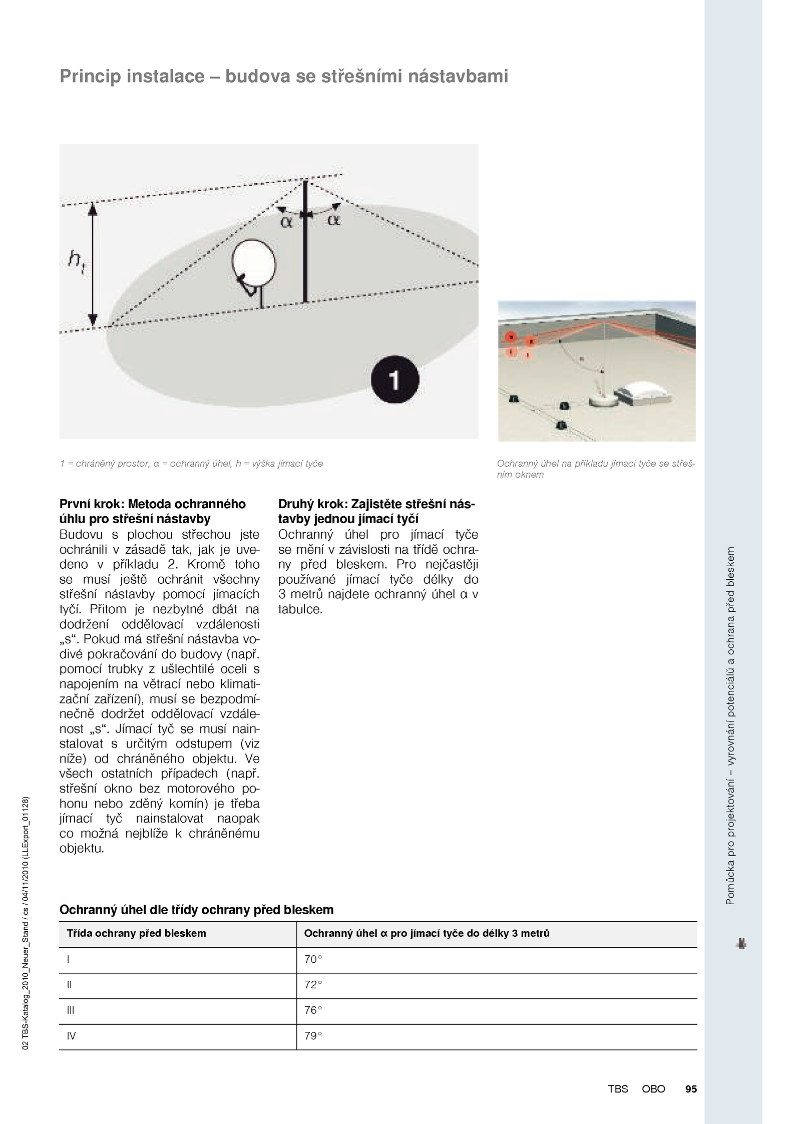 . Pokud má střešní nástavba vodivé pokračování budovy (např. Druhý krok: Zajistěte střešní nástavby jednou jímací tyčí Ochranný úhel pro jímací tyče se mění závislosti třídě ochrany před bleskem. Pro nejčastěji používané jímací tyče délky 3 metrů najdete ochranný úhel tabulce. pomocí trubky ušlechtilé oceli napojením větrací nebo klimatizační zařízení), musí bezpodmínečně dodržet oddělovací vzdálenost „s“.Princip instalace budova střešními nástavbami 1 chráněný prostor, ochranný úhel, výška jímací tyče Ochranný úhel příkladu jímací tyče střešním oknem 02 TBS-Katalog_2010_Neuer_Stand 04/11/2010 (LLExport_01128) Ochranný úhel dle třídy ochrany před bleskem Třída ochrany před bleskem Ochranný úhel pro jímací tyče délky metrů I III IV 70° 72° 76° 79° TBS OBO 95 Pomůcka pro projektování vyrovnání potenciálů ochrana před bleskem První krok: Metoda ochranného úhlu pro střešní nástavby Budovu plochou střechou jste ochránili zásadě tak, jak uvedeno příkladu Kromě toho se  musí ještě ochránit všechny střešní nástavby pomocí jímacích tyčí. Přitom nezbytné dbát dodržení oddělovací vzdálenosti „s“. všech ostatních případech (např. Jímací tyč se  musí nainstalovat určitým odstupem (viz níže) chráněného objektu. střešní okno bez  motorového pohonu nebo zděný komín) třeba jímací tyč nainstalovat naopak co  možná nejblíže chráněnému objektu