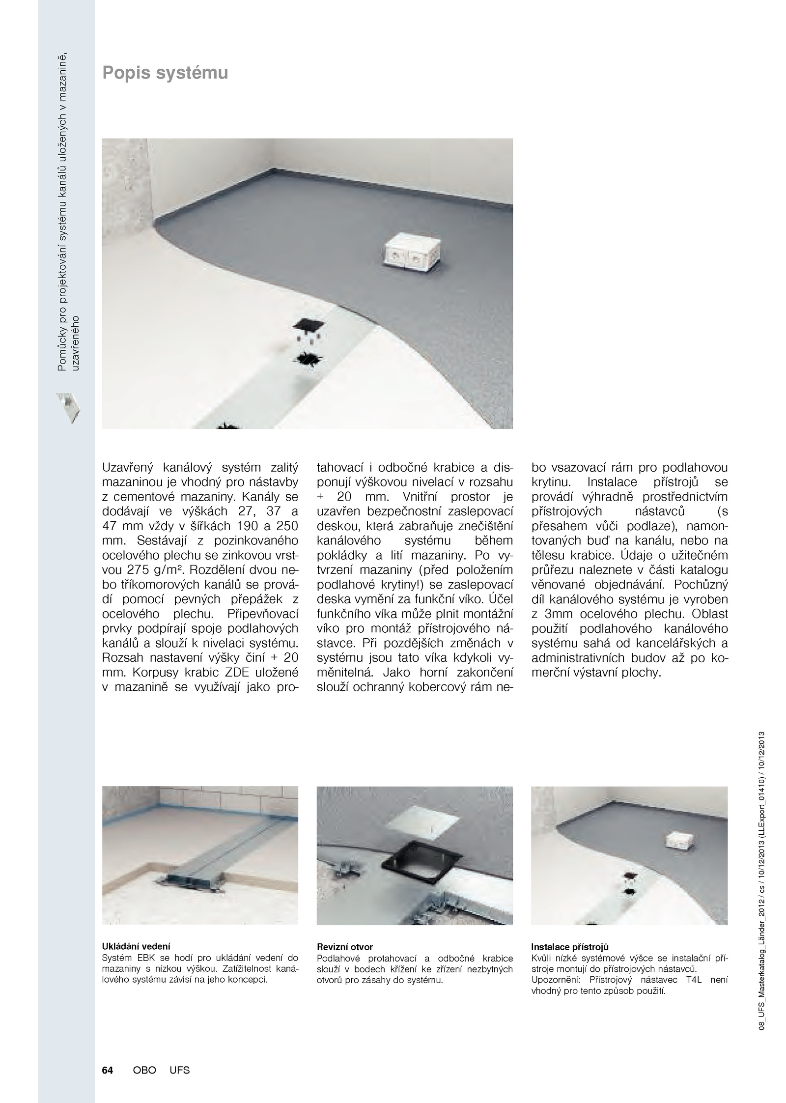 Při pozdějších změnách v systému jsou tato víka kdykoli vy- měnitelná. Jako horní zakončení slouží ochranný kobercový rám ne- bo vsazovací rám pro podlahovou krytinu. Revizní otvor Podlahové protahovací odbočné krabice slouží bodech křížení zřízení nezbytných otvorů pro zásahy systému.Pomůckyproprojektovánísystémukanálůuloženýchvmazanině, uzavřeného 64 OBO UFS 08_UFS_Masterkatalog_Länder_2012/cs/10/12/2013(LLExport_01410)/10/12/2013 Popis systému Uzavřený kanálový systém zalitý mazaninou vhodný pro nástavby z cementové mazaniny. Instalace přístrojů se provádí výhradně prostřednictvím přístrojových nástavců (s přesahem vůči podlaze), namon- tovaných buď kanálu, nebo na tělesu krabice. Sestávají pozinkovaného ocelového plechu zinkovou vrst- vou 275 g/m². Pochůzný díl kanálového systému vyroben z 3mm ocelového plechu. Korpusy krabic ZDE uložené v mazanině využívají jako pro- tahovací odbočné krabice dis- ponují výškovou nivelací rozsahu +  mm. Rozsah nastavení výšky činí 20 mm. Rozdělení dvou ne- bo tříkomorových kanálů prová- dí pomocí pevných přepážek z ocelového plechu. Zatížitelnost kaná- lového systému závisí jeho koncepci. . Kanály se dodávají výškách 27, a 47 mm vždy šířkách 190 250 mm. Instalace přístrojů Kvůli nízké systémové výšce instalační pří- stroje montují přístrojových nástavců. Účel funkčního víka může plnit montážní víko pro montáž přístrojového ná- stavce. Údaje užitečném průřezu naleznete části katalogu věnované objednávání. Připevňovací prvky podpírají spoje podlahových kanálů slouží nivelaci systému. Oblast použití podlahového kanálového systému sahá kancelářských a administrativních budov ko- merční výstavní plochy. vy- tvrzení mazaniny (před položením podlahové krytiny!) zaslepovací deska vymění funkční víko. Upozornění: Přístrojový nástavec T4L není vhodný pro tento způsob použití. Vnitřní prostor je uzavřen bezpečnostní zaslepovací deskou, která zabraňuje znečištění kanálového systému během pokládky lití mazaniny. Ukládání vedení Systém EBK hodí pro ukládání vedení do mazaniny nízkou výškou