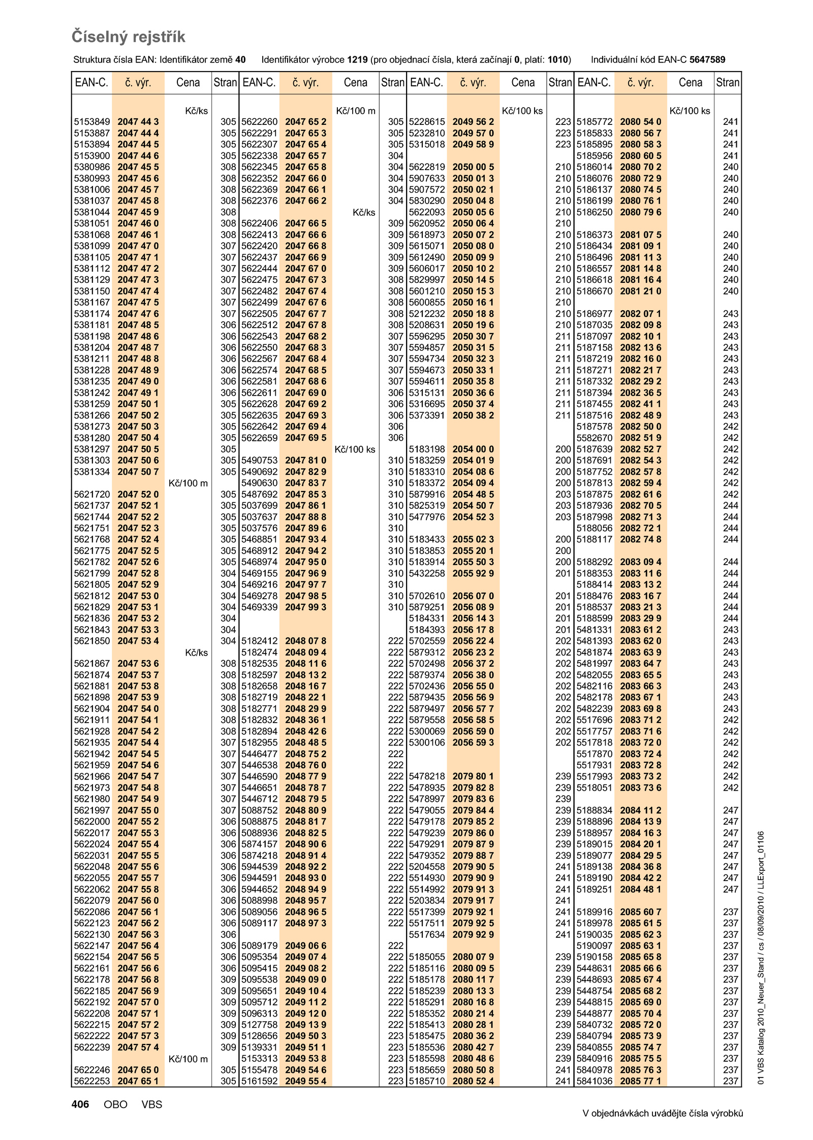 2047 2047 2047 2047 2047 2047 2047 2047 2047 2047 2047 2047 2047 2047 2047 2047 2047 2047 2047 2047 2047 2047 2047 2047 2047 2047 2047 2047 2047 2047 2047 2047 2047 2047 2047 2047 2047 2047 2047 2047 2047 2047 2048 2048 2048 2048 2048 2048 2048 2048 2048 2048 2048 2048 2048 2048 2048 2048 2048 2048 2048 2048 2048 2048 2048 2048 2048 2048 2049 2049 2049 2049 2049 2049 2049 2049 2049 2049 2049 2049 2049 4 Cena E Kč/100 m Stran EAN-C. výr. výr. Cena W Kč/100 ks Stran 241 241 241 241 240 240 240 240 240 240 240 240 240 240 240 243 243 243 243 243 243 243 243 243 243 242 242 242 242 242 242 242 244 244 244 244 244 244 244 244 244 244 243 243 243 243 243 243 243 243 242 242 242 242 242 242 242 247 247 247 247 247 247 247 247 237 237 237 237 237 237 237 237 237 237 237 237 237 237 237 237 5228615 2049 5232810 2049 5315018 2049 5622819 5907633 5907572 5830290 5622093 5620952 5618973 5615071 5612490 5606017 5829997 5601210 5600855 5212232 5208631 5596295 5594857 5594734 5594673 5594611 5315131 5316695 5373391 5183198 5183259 5183310 5183372 5879916 5825319 5477976 5183433 5183853 5183914 5432258 5702610 5879251 5184331 5184393 5702559 5879312 5702498 5879374 5702436 5879435 5879497 5879558 5300069 5300106 5478218 5478935 5478997 5479055 5479178 5479239 5479291 5479352 5204558 5514930 5514992 5203834 5517399 5517511 5517634 5185055 5185116 5185178 5185239 5185291 5185352 5185413 5185475 5185536 5185598 5185659 5185710 2050 2050 2050 2050 2050 2050 2050 2050 2050 2050 2050 2050 2050 2050 2050 2050 2050 2050 2050 2050 2050 2050 2050 2054 2054 2054 2054 2054 2054 2054 2055 2055 2055 2055 2056 2056 2056 2056 2056 2056 2056 2056 2056 2056 2056 2056 2056 2056 2079 2079 2079 2079 2079 2079 2079 2079 2079 2079 2079 2079 2079 2079 2079 2080 2080 2080 2080 2080 2080 2080 2080 2080 2080 2080 2080 4 Kč/ks Kč/100 ks E Kč/100 m Kč/ks 5622246 2047 5622253 2047 1 Kč/100 m 305 305 305 305 305 305 305 304 304 304 304 304 304 304 5182412 5182474 308 5182535 308 5182597 308 5182658 308 5182719 308 5182771 308 5182832 308 5182894 307 5182955 307 5446477 307 5446538 307 5446590 307 5446651 307 5446712 307 5088752 306 5088875 306 5088936 306 5874157 306 5874218 306 5944539 306 5944591 306 5944652 306 5088998 306 5089056 306 5089117 306 306 5089179 306 5095354 306 5095415 309 5095538 309 5095651 309 5095712 309 5096313 309 5127758 309 5128656 309 5139331 5153313 305 5155478 305 5161592 V W 223 5185772 2080 223 5185833 2080 223 5185895 2080 5185956 2080 210 5186014 2080 210 5186076 2080 210 5186137 2080 210 5186199 2080 210 5186250 2080 210 210 5186373 2081 210 5186434 2081 210 5186496 2081 210 5186557 2081 210 5186618 2081 210 5186670 2081 210 210 5186977 2082 210 5187035 2082 211 5187097 2082 211 5187158 2082 211 5187219 2082 211 5187271 2082 211 5187332 2082 211 5187394 2082 211 5187455 2082 211 5187516 2082 5187578 2082 5582670 2082 200 5187639 2082 200 5187691 2082 200 5187752 2082 200 5187813 2082 203 5187875 2082 203 5187936 2082 203 5187998 2082 5188056 2082 200 5188117 2082 200 200 5188292 2083 201 5188353 2083 5188414 2083 201 5188476 2083 201 5188537 2083 201 5188599 2083 201 5481331 2083 202 5481393 2083 202 5481874 2083 202 5481997 2083 202 5482055 2083 202 5482116 2083 202 5482178 2083 202 5482239 2083 202 5517696 2083 202 5517757 2083 202 5517818 2083 5517870 2083 5517931 2083 239 5517993 2083 239 5518051 2083 239 239 5188834 2084 239 5188896 2084 239 5188957 2084 239 5189015 2084 239 5189077 2084 241 5189138 2084 241 5189190 2084 241 5189251 2084 241 241 5189916 2085 241 5189978 2085 241 5190035 2085 5190097 2085 239 5190158 2085 239 5448631 2085 239 5448693 2085 239 5448754 2085 239 5448815 2085 239 5448877 2085 239 5840732 2085 239 5840794 2085 239 5840855 2085 239 5840916 2085 241 5840978 2085 241 5841036 2085 1 406 OBO VBS V objednávkách uvádějte čísla výrobků 01 VBS Katalog 2010_Neuer_Stand 08/09/2010 LLExport_01106 . 305 305 305 305 308 308 308 308 308 308 308 307 307 307 307 307 307 307 306 306 306 306 306 306 306 305 305 305 305 305 305 305 5622260 5622291 5622307 5622338 5622345 5622352 5622369 5622376 5622406 5622413 5622420 5622437 5622444 5622475 5622482 5622499 5622505 5622512 5622543 5622550 5622567 5622574 5622581 5622611 5622628 5622635 5622642 5622659 5490753 5490692 5490630 5487692 5037699 5037637 5037576 5468851 5468912 5468974 5469155 5469216 5469278 5469339 č. 305 305 305 304 304 304 304 304 309 309 309 309 309 308 308 308 308 308 307 307 307 307 307 306 306 306 306 306 310 310 310 310 310 310 310 310 310 310 310 310 310 310 222 222 222 222 222 222 222 222 222 222 222 222 222 222 222 222 222 222 222 222 222 222 222 222 222 222 222 222 222 222 222 222 222 222 223 223 223 223 223 č. č. výr. Cena V Kč/100 ks Stran EAN-C. 5153849 5153887 5153894 5153900 5380986 5380993 5381006 5381037 5381044 5381051 5381068 5381099 5381105 5381112 5381129 5381150 5381167 5381174 5381181 5381198 5381204 5381211 5381228 5381235 5381242 5381259 5381266 5381273 5381280 5381297 5381303 5381334 5621720 5621737 5621744 5621751 5621768 5621775 5621782 5621799 5621805 5621812 5621829 5621836 5621843 5621850 5621867 5621874 5621881 5621898 5621904 5621911 5621928 5621935 5621942 5621959 5621966 5621973 5621980 5621997 5622000 5622017 5622024 5622031 5622048 5622055 5622062 5622079 5622086 5622123 5622130 5622147 5622154 5622161 5622178 5622185 5622192 5622208 5622215 5622222 5622239 č. 2047 2047 2047 2047 2047 2047 2047 2047 2047 2047 2047 2047 2047 2047 2047 2047 2047 2047 2047 2047 2047 2047 2047 2047 2047 2047 2047 2047 2047 2047 2047 2047 2047 2047 2047 2047 2047 2047 2047 2047 2047 2047 2047 2047 2047 2047 2047 2047 2047 2047 2047 2047 2047 2047 2047 2047 2047 2047 2047 2047 2047 2047 2047 2047 2047 2047 2047 2047 2047 2047 2047 2047 2047 2047 2047 2047 2047 2047 2047 2047 2047 4 Cena E Kč/ks Stran EAN-C. výr.Číselný rejstřík Struktura čísla EAN: Identifikátor země Identifikátor výrobce 1219 (pro objednací čísla, která začínají platí: 1010) Individuální kód EAN-C 