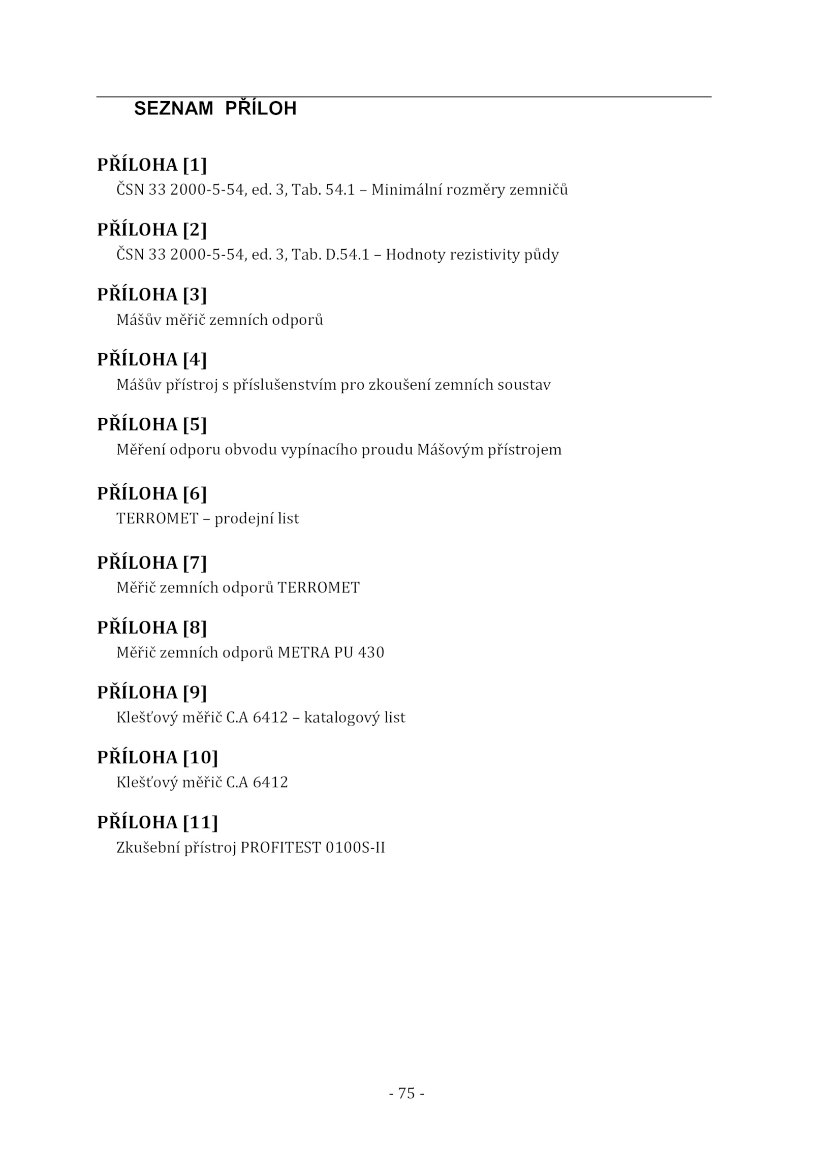Tab.A 6412 katalogový list PŘÍLOHA [10] Klešťový měřič C. 54.- SEZNAM PŘÍLOH PŘÍLOHA [1] ČSN 2000-5-54, ed.1 Hodnoty rezistivity půdy PŘÍLOHA [3] Mášův měřič zemních odporů PŘÍLOHA [4] Mášův přístroj příslušenstvím pro zkoušení zemních soustav PŘÍLOHA [5] Měření odporu obvodu vypínacího proudu Mášovým přístrojem PŘÍLOHA [6] TERROMET prodejní list PŘÍLOHA [7] Měřič zemních odporů TERROMET PŘÍLOHA [8] Měřič zemních odporů METRA 430 PŘÍLOHA [9] Klešťový měřič C.A 6412 PŘÍLOHA [11] Zkušební přístroj PROFITEST 0100S-II . Tab.54. D.1 Minimální rozměry zemničů PŘÍLOHA [2] ČSN 2000-5-54, ed
