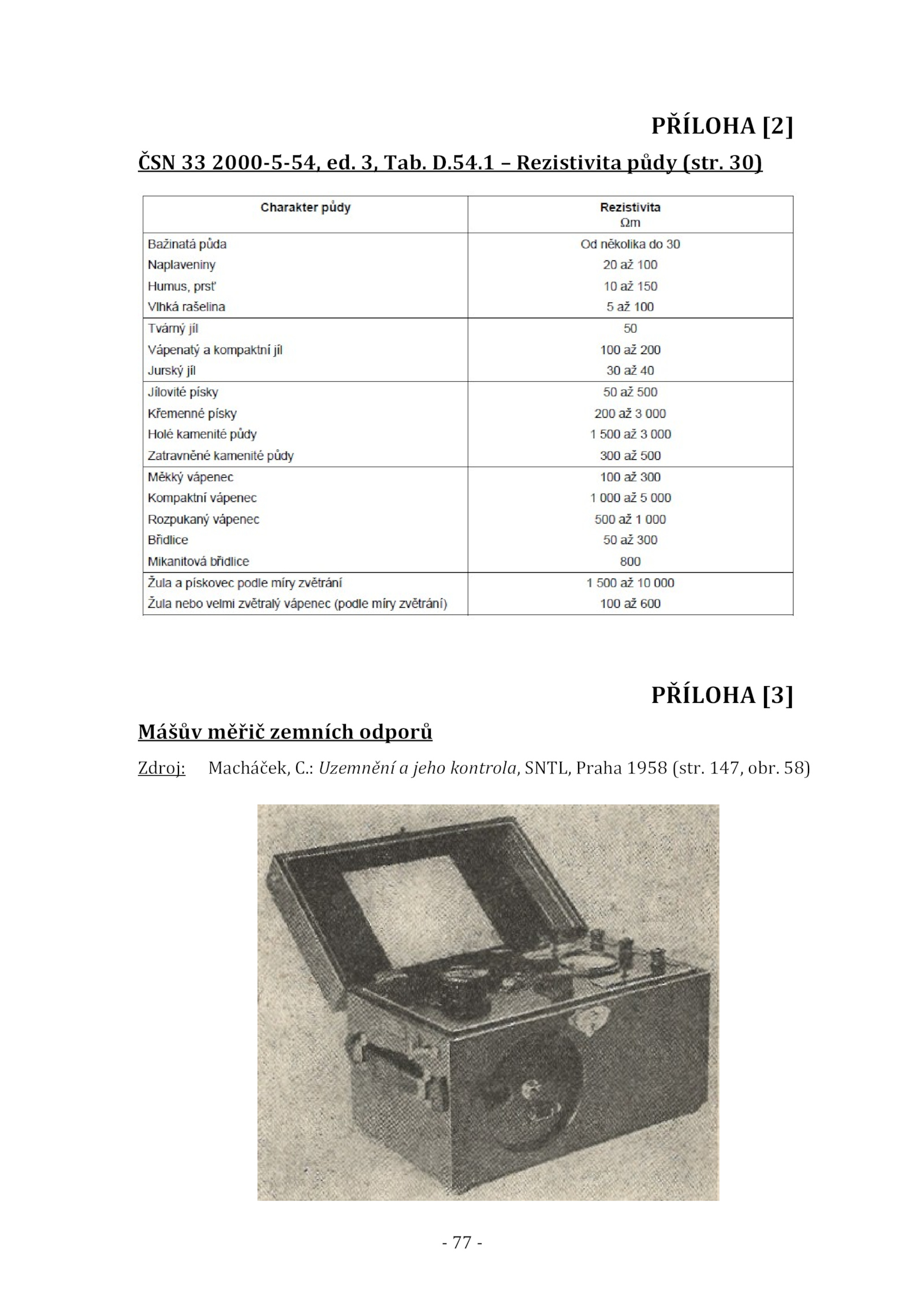 30) PŘÍLOHA [3] Mášův měřič zemních odporů Zdroj: Macháček, C.1 Rezistivita půdy (str. D.: Uzemnění jeho kontrola, SNTL, Praha 1958 (str. 147, obr.54.- PŘÍLOHA [2] ČSN 2000-5-54, ed. Tab. 58)