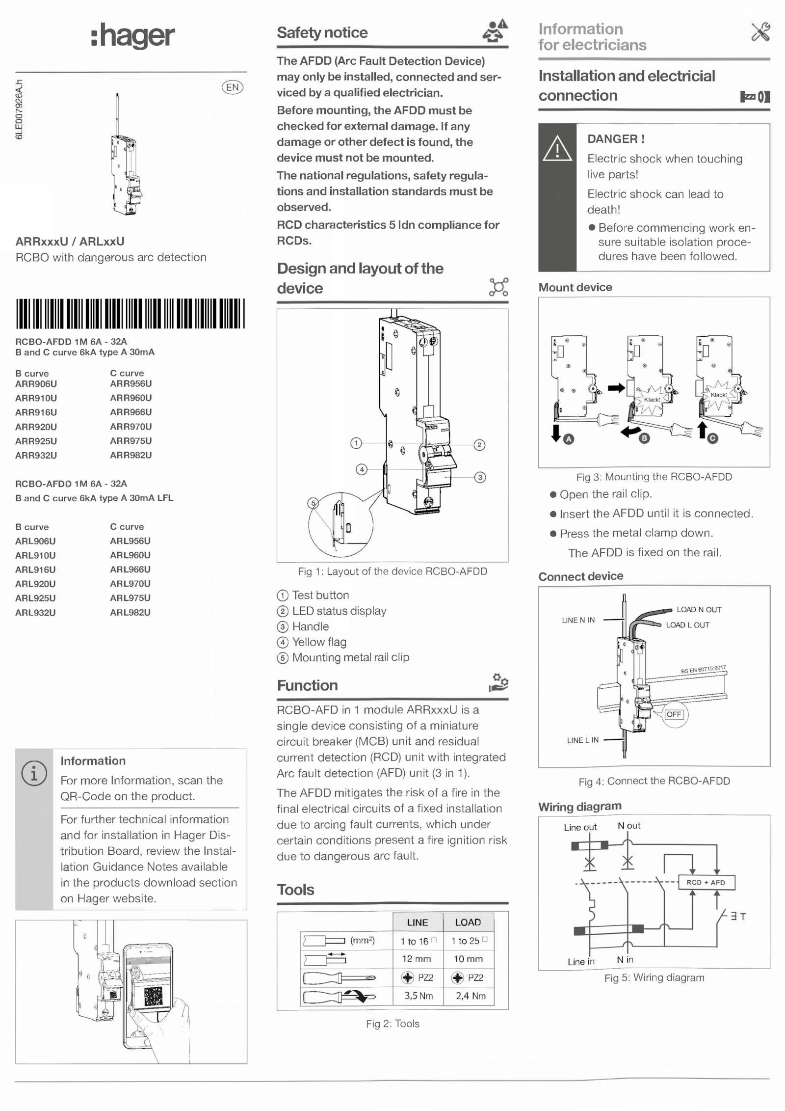 Before mounting, the AFDD must be checked for external damage. Tools Fig Tools Information for electricians Installation and electricial connection 1=01 DANGER! Electric shock when touching live parts! Electric shock can lead to death! • Before commencing work en sure suitable isolation proce dures have been followed.:hager ARRxxxU ARLxxU RCBO with dangerous arc detection RCBO-AFDD 32A B and curve 6kA type 30mA B curve ARR906U ARR910U ARR916U ARR920U ARR925U ARR932U C curve ARR956U ARR960U ARR966U ARR970U ARR975U ARR982U RCBO-AFD! 32A B and curve 6kA type 30mA LFL B curve ARL906U ARL910U ARL916U ARL920U ARL925U ARL932U C curve ARL956U ARL960U ARL966U ARL970U ARL975U ARL982U © Information For more Information, scan the QR-Code the product. Design and layout the device Fig Layout the device RCBO-AFDD © Test button @ LED status display @ Handle © Yellow flag @ Mounting metal rail clip Function RCBO-AFD module ARRxxxU a single device consisting miniature circuit breaker (MCB) unit and residual current detection (RCD) unit with integrated Arc fault detection (AFD) unit 1). • Insert the AFDD until connected. • Press the metal clamp down. any damage other defect found, the device must not mounted. The AFDD fixed the rail. The AFDD mitigates the risk fire the final electrical circuits fixed installation due arcing fault currents, which under certain conditions present afire ignition risk due dangerous arc fault. The national regulations, safety regula tions and installation standards must be observed. RCD characteristics Idn compliance for RCDs. For further technical information and for installation Hager Dis tribution Board, review the Instal lation Guidance Notes available in the products download section on Hager website. Mount device Fig Mounting the RCBO-AFDD • Open the rail clip. Safety notice The AFDD (Arc Fault Detection Device) may only installed, connected and ser viced qualified electrician.