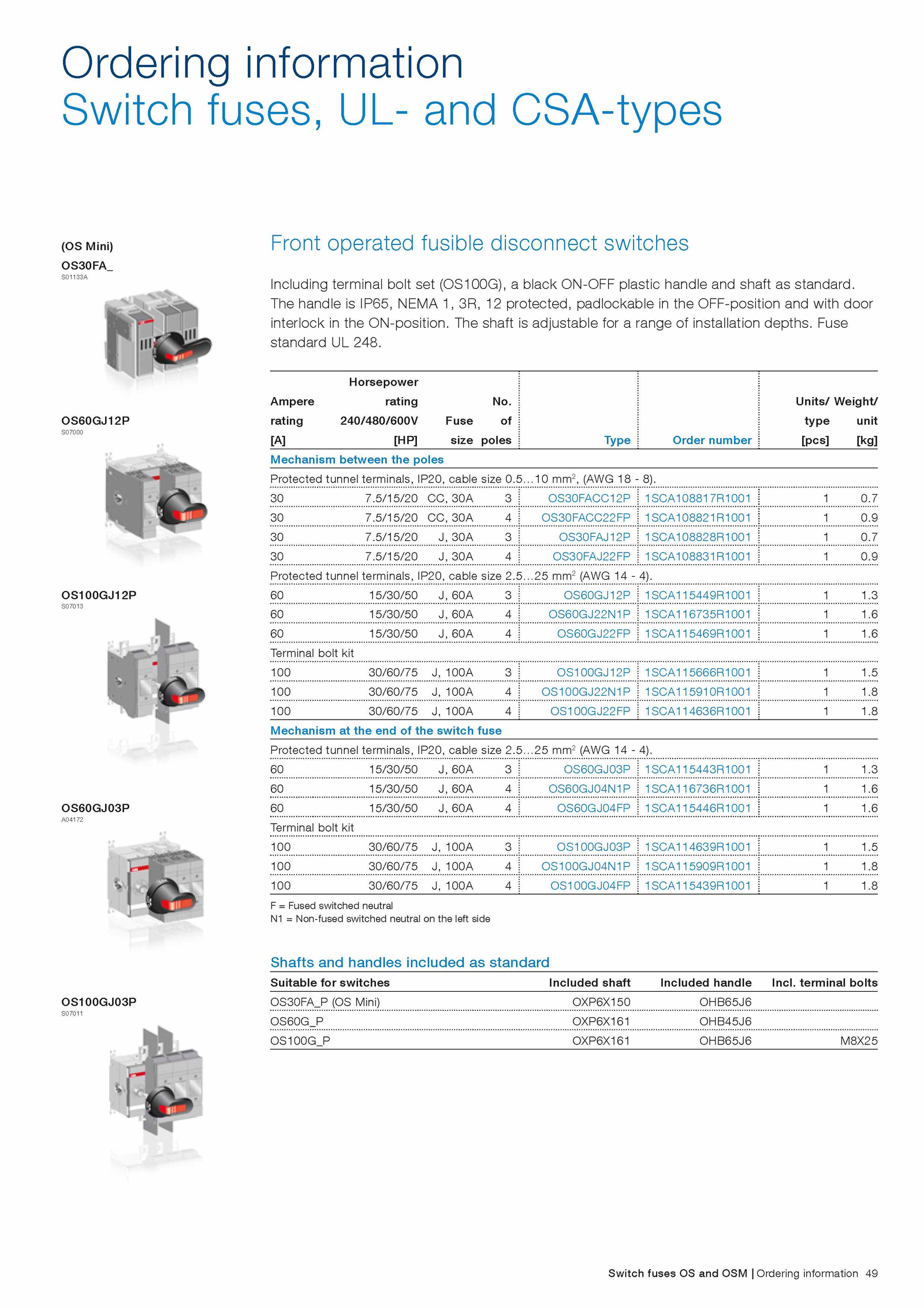 9 P 4).8 1 .Ordering information Switch fuses, UL- and CSA-types (O i) 0 _ S01133A O P S0700C O P SC7C13 Front operated fusible disconnect switches In clu SIO G), stic dle and sta . H r A tin its t/ ra tin it [A ] M s P 8). 6 .7 3 .6 6 .9 3 .6 T it 1 .6 T it 1 .3 6 .8 1 .8 F Fused switched neutral N1 Non-fused switched neutral the left side Shafts and handles included standard S ita itc lts O ini) 6 O 6 O 5 Switch fuses and OSM rde ring tio 49 .5 1 .8 M itc e P 4). 3 .6 6 . 6 .7 3 .5 1 . The dle IP65, 3R, sitio and ith r in rlo itio The for ran sta lla tio Fuse sta 248.3 6