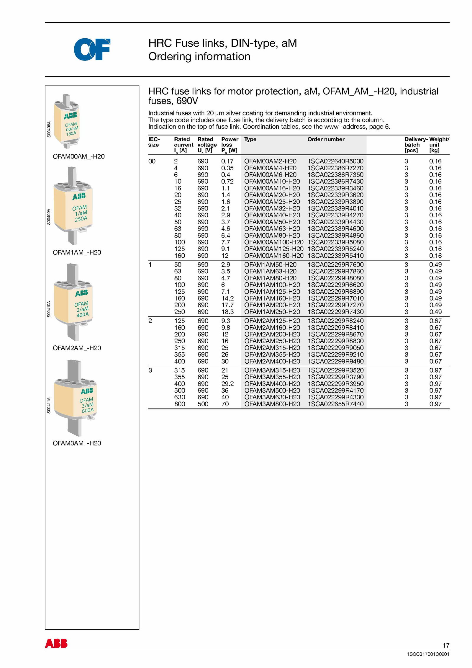 Industrial fuses with silver coating for demanding industrial environment.17 0FAM00AM2-H20 1SCA022640R5000 0.5 0FAM1AM63-H20 1SCA022299R7860 0.16