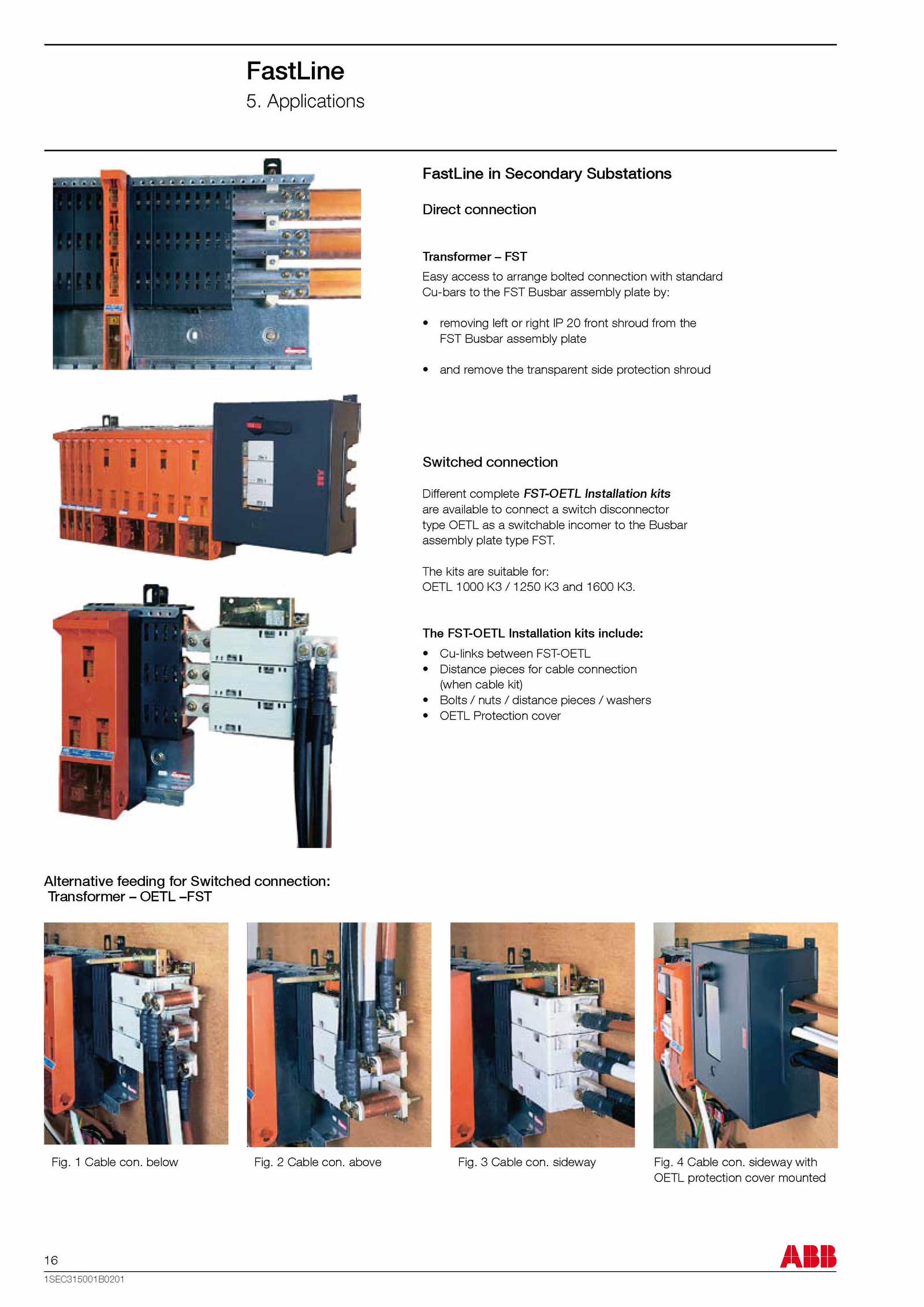 below Fig. Cable con. sideway Fig. Applications FastLine Secondary Substations Direct connection T T Easy access arrange bolted connection with standard Cu-bars the FST Busbar assembly plate by: • removing left right front shroud from the FST Busbar assembly plate • and remove the transparent side protection shroud Switched connection Different com plete FST-OETL sta lla tio kits are available connect switch disconnector type OETL switchable incom the Busbar assembly plate type FST. Cable con. Cable con. Cable con. The kits are suitable for: OETL 1000 1250 and 1600 K3. above Fig. sideway ith OETL protection cover mounted 16 Ik I 1SEC315001B0201 . T lla tio its : • Cu-links between FST-OETL • Distance pieces for cable connection (when cable kit) • Bolts nuts distance pieces washers • OETL Protection cover Alternative feeding for Switched connection: Transformer OETL -FST Fig.FastLine 5
