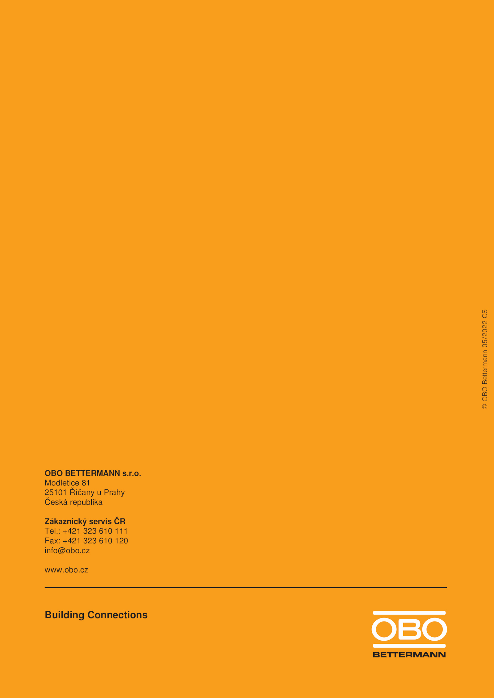 cz Building Connections © OBO Bettermann 05/2022 CS .o.: +421 323 610 111 Fax: +421 323 610 120 info@obo.OBO BETTERMANN s.cz www.r. Modletice 81 25101 Říčany Prahy Česká republika Zákaznický servis ČR Tel.obo