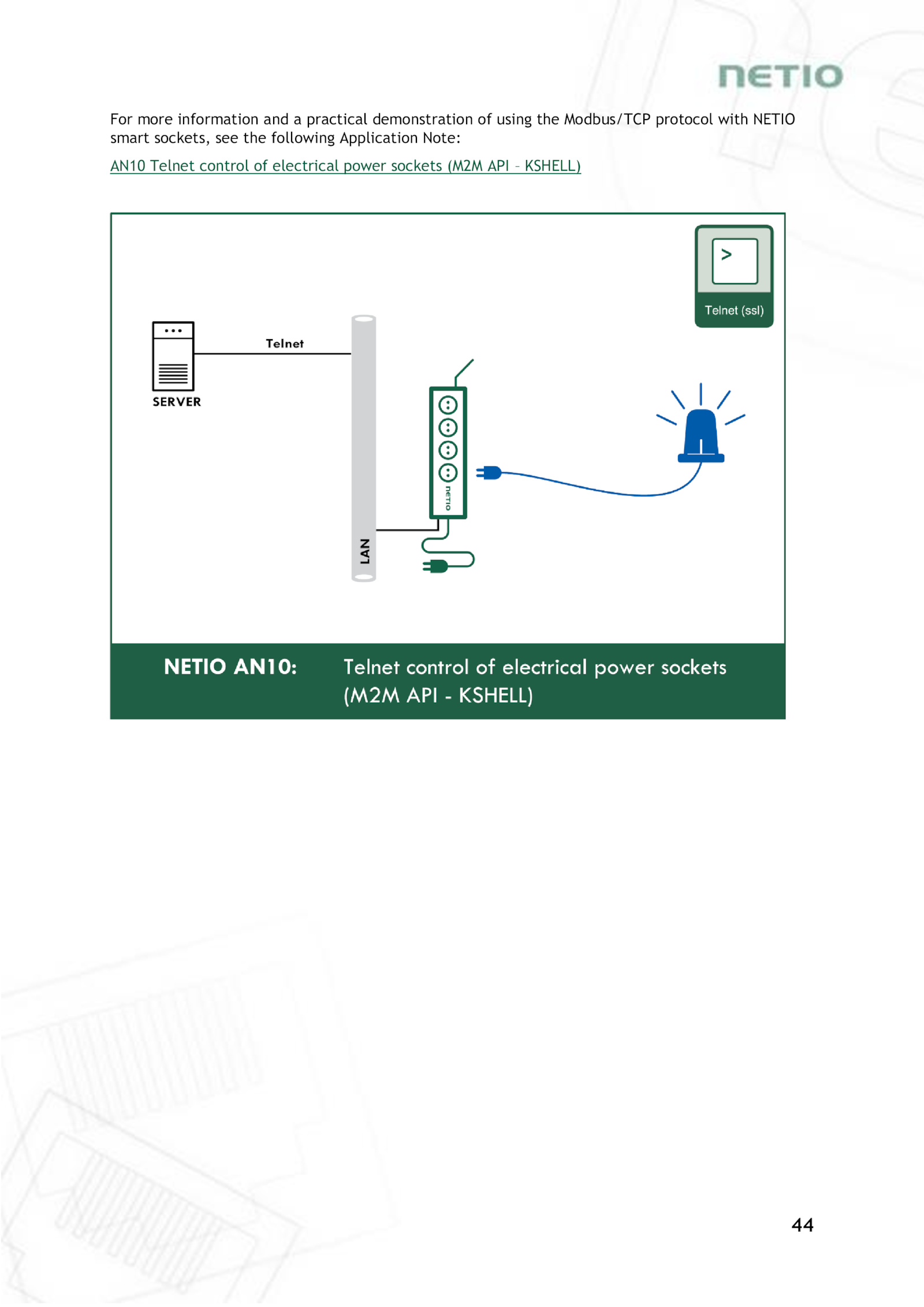 44 For more information and practical demonstration using the Modbus/TCP protocol with NETIO smart sockets, see the following Application Note: AN10 Telnet control electrical power sockets (M2M API KSHELL)