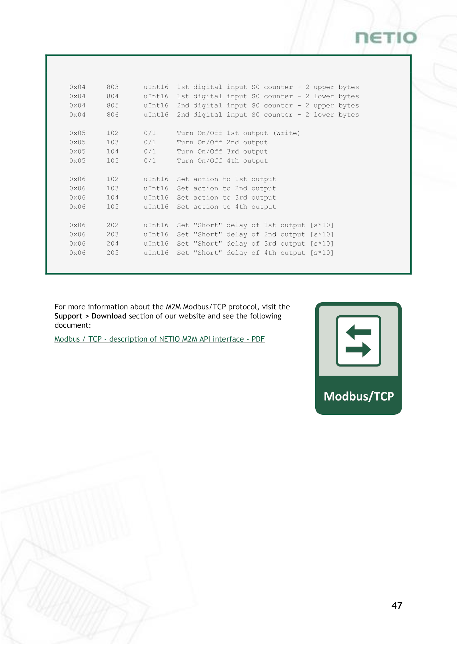 47 0x04 803 uInt16 1st digital input counter upper bytes 0x04 804 uInt16 1st digital input counter lower bytes 0x04 805 uInt16 2nd digital input counter upper bytes 0x04 806 uInt16 2nd digital input counter lower bytes 0x05 102 0/1 Turn On/Off 1st output (Write) 0x05 103 0/1 Turn On/Off 2nd output 0x05 104 0/1 Turn On/Off 3rd output 0x05 105 0/1 Turn On/Off 4th output 0x06 102 uInt16 Set action 1st output 0x06 103 uInt16 Set action 2nd output 0x06 104 uInt16 Set action 3rd output 0x06 105 uInt16 Set action 4th output 0x06 202 uInt16 Set "Short" delay 1st output [s*10] 0x06 203 uInt16 Set "Short" delay 2nd output [s*10] 0x06 204 uInt16 Set "Short" delay 3rd output [s*10] 0x06 205 uInt16 Set "Short" delay 4th output [s*10] For more information about the M2M Modbus/TCP protocol, visit the Support Download section our website and see the following document: Modbus TCP description NETIO M2M API interface PDF