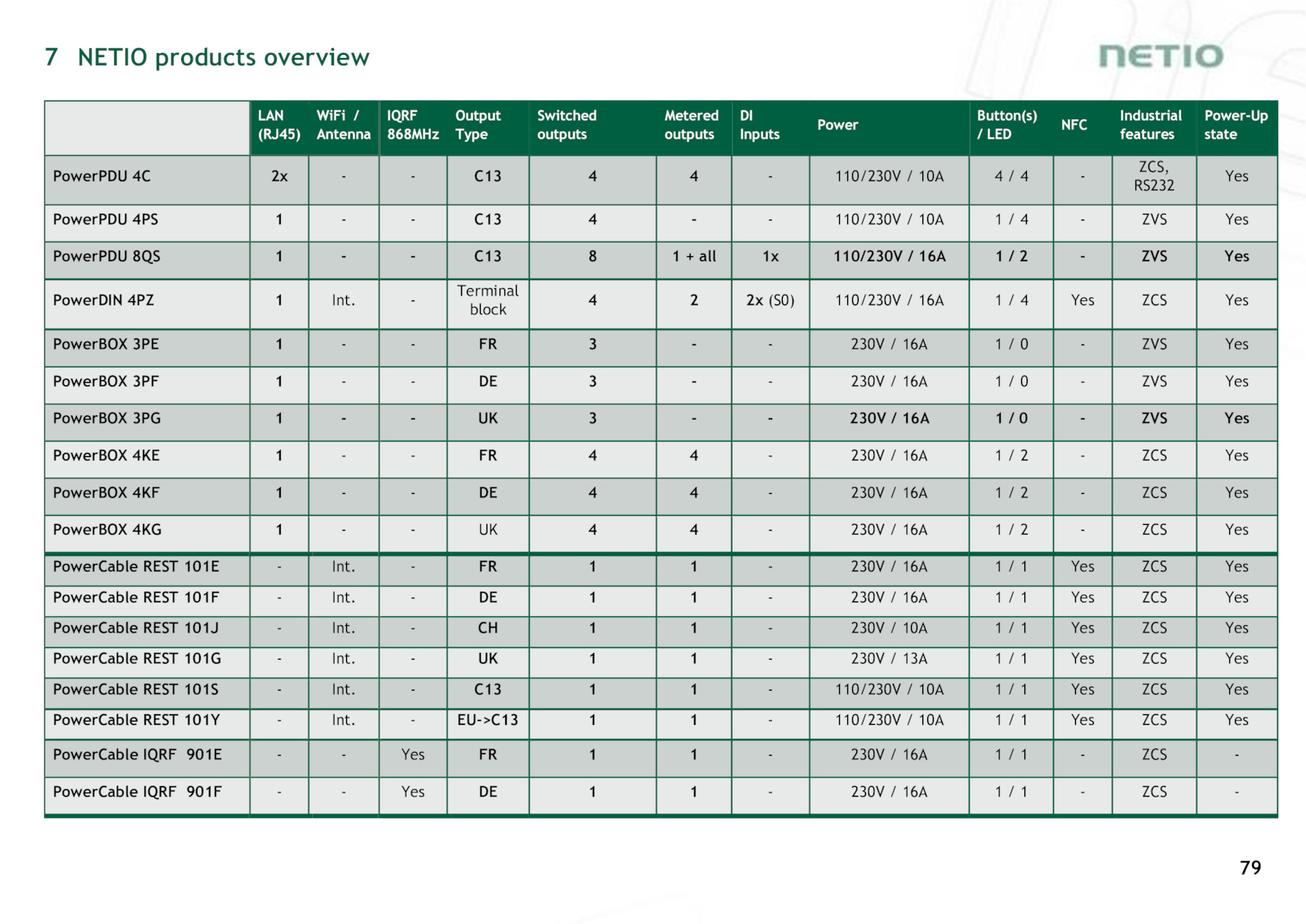 230V 16A Yes ZCS Yes PowerCable REST 101J Int. C13 110/230V 10A Yes ZCS Yes PowerCable REST 101Y Int. 230V 16A Yes ZCS Yes PowerCable REST 101F Int. EU->C13 110/230V 10A Yes ZCS Yes PowerCable IQRF 901E Yes 230V 16A ZCS - PowerCable IQRF 901F Yes 230V 16A ZCS. 230V 13A Yes ZCS Yes PowerCable REST 101S Int. - Terminal block 4 (S0) 110/230V 16A Yes ZCS Yes PowerBOX 3PE 230V 16A ZVS Yes PowerBOX 3PF 230V 16A ZVS Yes PowerBOX 3PG 230V 16A ZVS Yes PowerBOX 4KE 230V 16A ZCS Yes PowerBOX 4KF 230V 16A ZCS Yes PowerBOX 4KG 230V 16A ZCS Yes PowerCable REST 101E Int. 230V 10A Yes ZCS Yes PowerCable REST 101G Int.79 7 NETIO products overview LAN (RJ45) WiFi / Antenna IQRF 868MHz Output Type Switched outputs Metered outputs DI Inputs Power Button(s) / LED NFC Industrial features Power-Up state PowerPDU C13 110/230V 10A - ZCS, RS232 Yes PowerPDU 4PS C13 110/230V 10A ZVS Yes PowerPDU 8QS C13 all 110/230V 16A ZVS Yes PowerDIN 4PZ Int