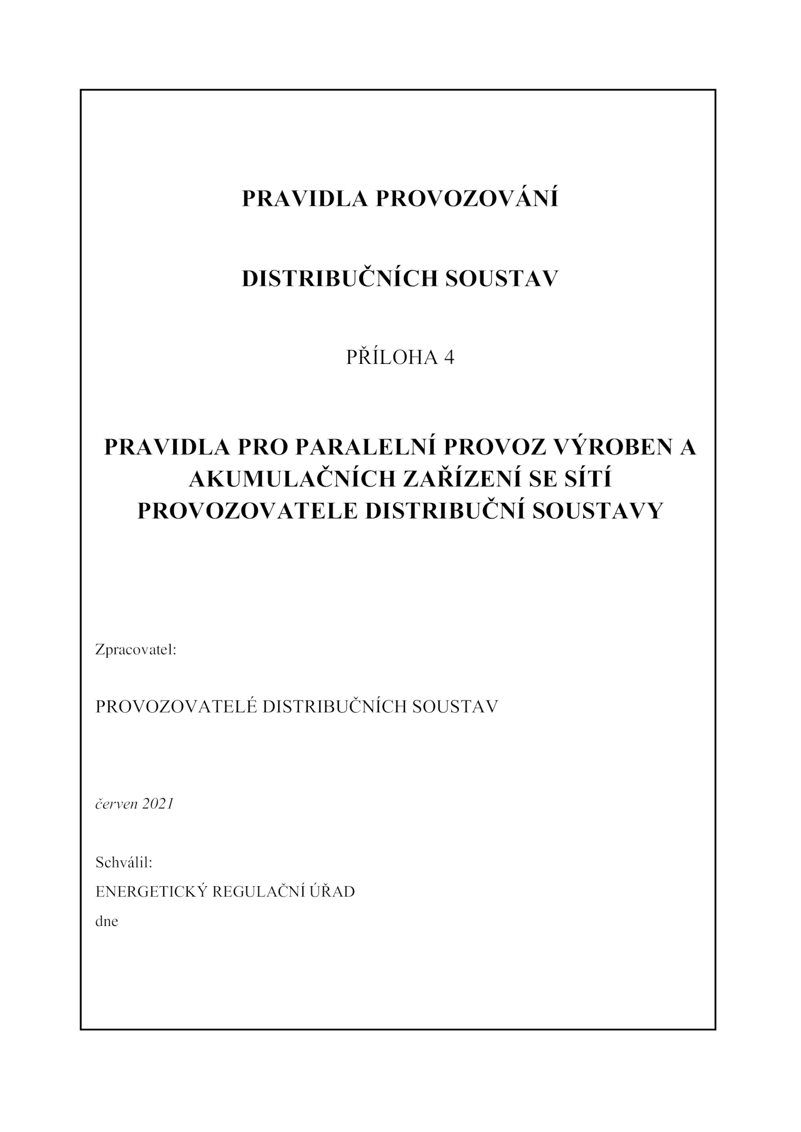 PRAVIDLA PROVOZOVÁNÍ DISTRIBUČNÍCH SOUSTAV PŘÍLOHA 4 PRAVIDLA PRO PARALELNÍ PROVOZ VÝROBEN A AKUMULAČNÍCH ZAŘÍZENÍ SÍTÍ PROVOZOVATELE DISTRIBUČNÍ SOUSTAVY Zpracovatel: PROVOZOVATELÉ DISTRIBUČNÍCH SOUSTAV červen 2021 Schválil: ENERGETICKÝ REGULAČNÍ ÚŘAD dne