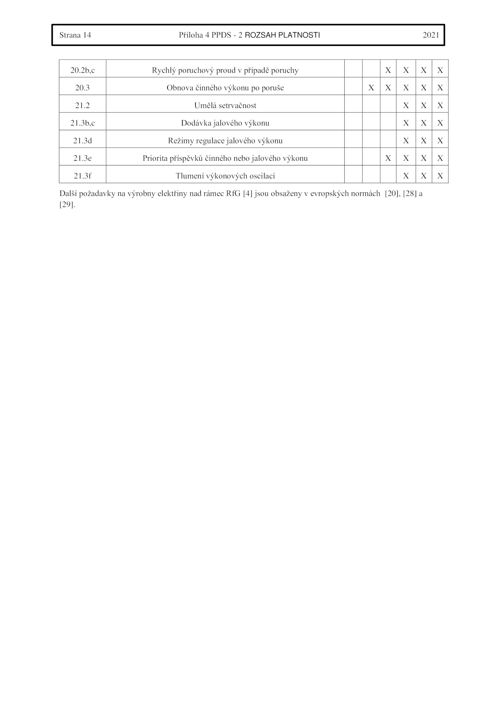 2 Umělá setrvačnost X 21. .2b,c Rychlý poruchový proud případě poruchy X 20.3 Obnova činného výkonu poruše X 21.Strana Příloha PPDS ROZSAH PLATNOSTI 2021 20.3b,c Dodávka jalového výkonu X 21.3e Priorita příspěvků činného nebo jalového výkonu X 21.3f Tlumení výkonových oscilací X Další požadavky výrobny elektřiny nad rámec RfG [4] jsou obsaženy evropských normách [20], [28] a [29].3d Režimy regulace jalového výkonu X 21
