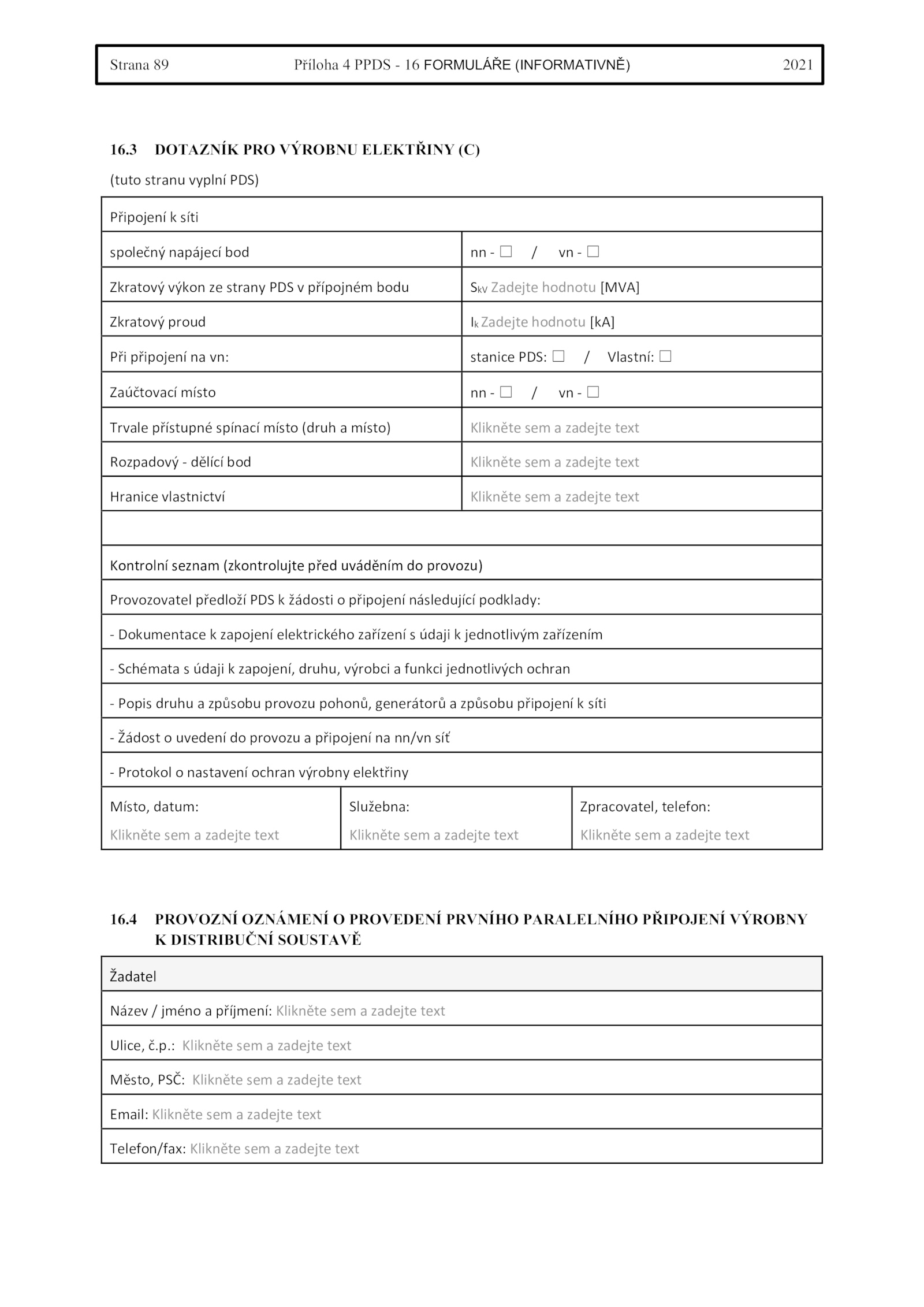 Provozovatel předloží PDS žádosti připojení následující podklady: