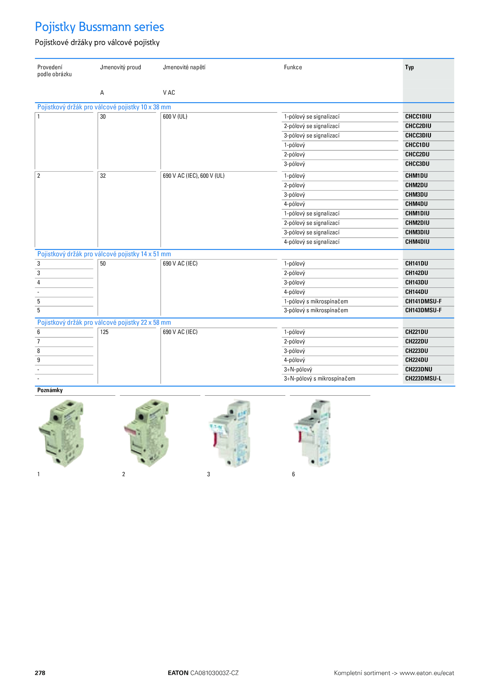 278 EATON CA08103003Z-CZ Kompletní sortiment www.eaton.eu/ecat 278 EATON CORPORATION CA08103003Z-CS Pojistky Bussmann series Pojistkové držáky pro válcové pojistky Pojistkové držáky pro válcové pojistky Provedení podle obrázku Jmenovitý proud Jmenovité napětí Funkce Typ A AC Pojistkový držák pro válcové pojistky mm 1 600 (UL) 1-pólový signalizací CHCC1DIU 2-pólový signalizací CHCC2DIU 3-pólový signalizací CHCC3DIU 1-pólový CHCC1DU 2-pólový CHCC2DU 3-pólový CHCC3DU 2 690 (IEC), 600 (UL) 1-pólový CHM1DU 2-pólový CHM2DU 3-pólový CHM3DU 4-pólový CHM4DU 1-pólový signalizací CHM1DIU 2-pólový signalizací CHM2DIU 3-pólový signalizací CHM3DIU 4-pólový signalizací CHM4DIU Pojistkový držák pro válcové pojistky mm 3 690 (IEC) 1-pólový CH141DU 3 2-pólový CH142DU 4 3-pólový CH143DU - 4-pólový CH144DU 5 1-pólový mikrospínačem CH141DMSU-F 5 3-pólový mikrospínačem CH143DMSU-F Pojistkový držák pro válcové pojistky mm 6 125 690 (IEC) 1-pólový CH221DU 7 2-pólový CH222DU 8 3-pólový CH223DU 9 4-pólový CH224DU - 3+N-pólový CH223DNU - 3+N-pólový mikrospínačem CH223DMSU-L Poznámky 1