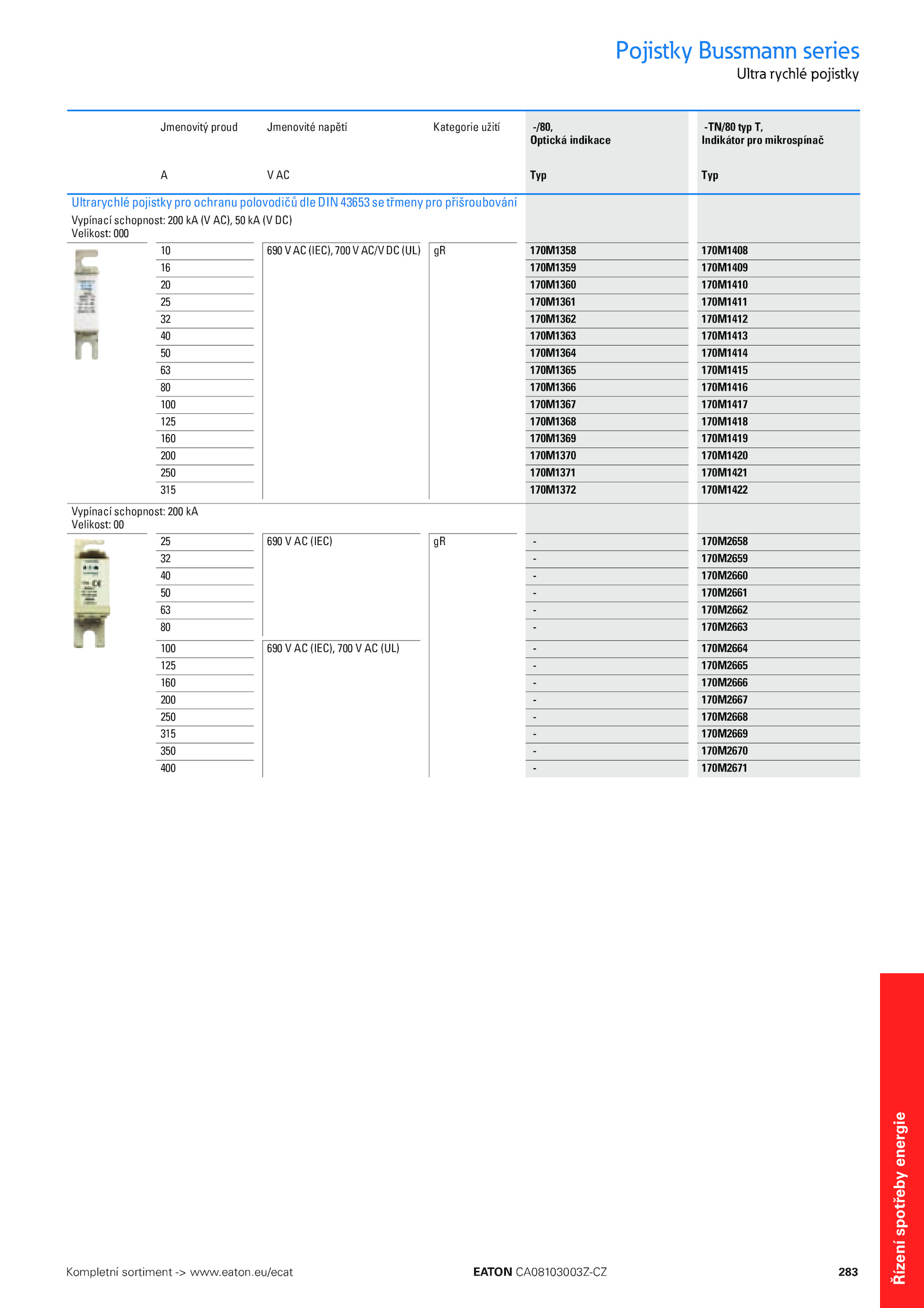 eu/ecat EATON CORPORATION CA08103003Z-CS 283 Pojistky Bussmann series Ultra rychlé pojistky Řízení spotřeby energie Ultra rychlé pojistky Jmenovitý proud Jmenovité napětí Kategorie užití -/80, Optická indikace -TN/80 typ T, Indikátor pro mikrospínač A Typ Typ Ultrarychlé pojistky pro ochranu polovodičů dle DIN 43653 třmeny pro přišroubování Vypínací schopnost: 200 AC), DC) Velikost: 000 10 690 (IEC), 700 AC/V (UL) 170M1358 170M1408 16 170M1359 170M1409 20 170M1360 170M1410 25 170M1361 170M1411 32 170M1362 170M1412 40 170M1363 170M1413 50 170M1364 170M1414 63 170M1365 170M1415 80 170M1366 170M1416 100 170M1367 170M1417 125 170M1368 170M1418 160 170M1369 170M1419 200 170M1370 170M1420 250 170M1371 170M1421 315 170M1372 170M1422 Vypínací schopnost: 200 kA Velikost: 00 25 690 (IEC) 170M2658 32 170M2659 40 170M2660 50 170M2661 63 170M2662 80 170M2663 100 690 (IEC), 700 (UL) 170M2664 125 170M2665 160 170M2666 200 170M2667 250 170M2668 315 170M2669 350 170M2670 400 170M2671 .283 Řízení spotřeby energie EATON CA08103003Z-CZ Kompletní sortiment www.eaton