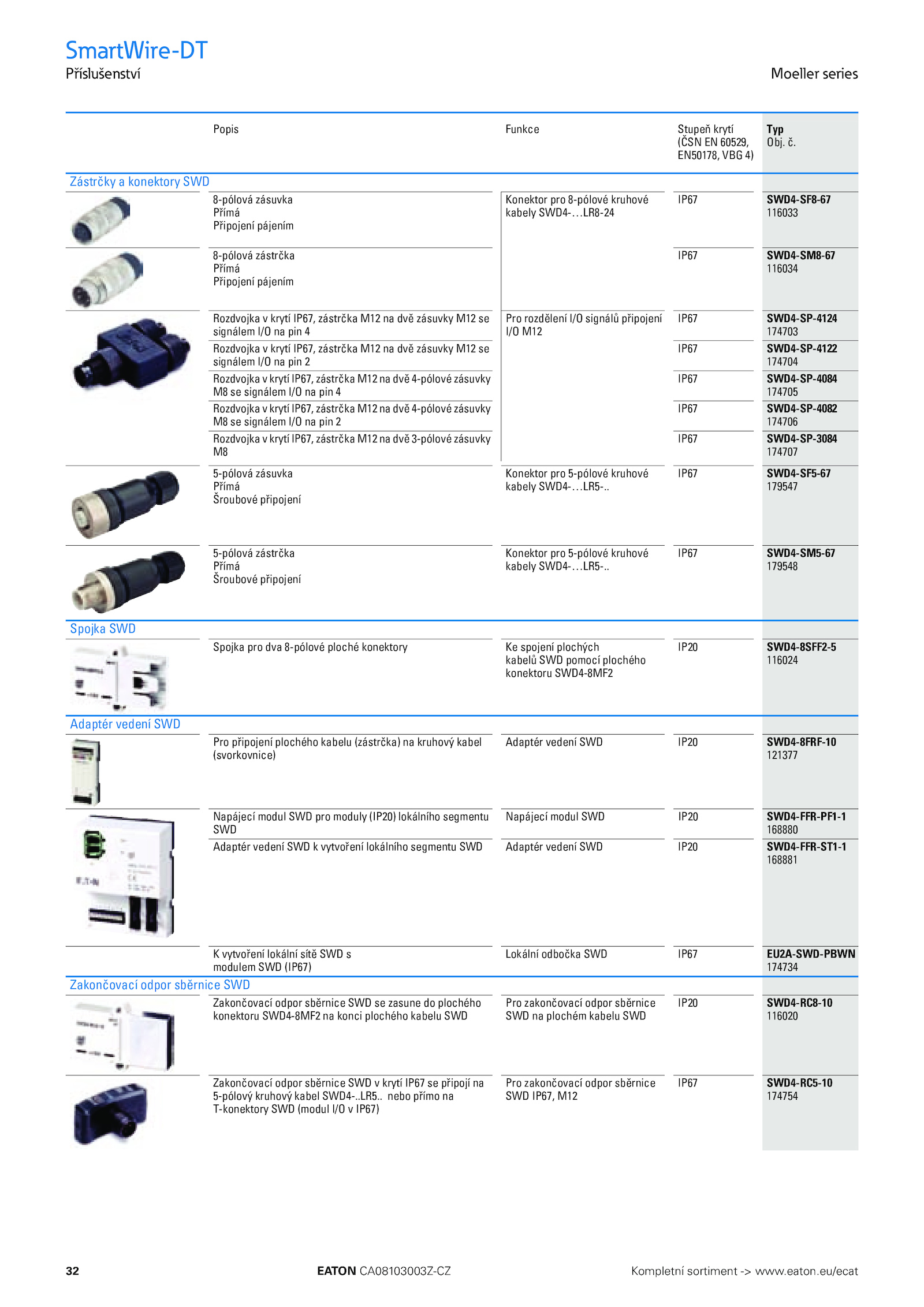. IP67 SWD4-SF5-67 179547 5-pólová zástrčka Přímá Šroubové připojení Konektor pro 5-pólové kruhové kabely SWD4-…LR5-.LR5. č. nebo přímo na T-konektory SWD (modul I/O IP67) Pro zakončovací odpor sběrnice SWD IP67, M12 IP67 SWD4-RC5-10 174754 Popis Funkce Stupeň krytí (ČSN 60529, EN50178, VBG 4) Typ Obj..eu/ecat EATON CA08103003Z-CZ 32 EATON CORPORATION CA08103003Z-CS SmartWire-DT Příslušenství Moeller series Zástrčky konektory SWD 8-pólová zásuvka Přímá Připojení pájením Konektor pro 8-pólové kruhové kabely SWD4-…LR8-24 IP67 SWD4-SF8-67 116033 8-pólová zástrčka Přímá Připojení pájením IP67 SWD4-SM8-67 116034 Rozdvojka krytí IP67, zástrčka M12 dvě zásuvky M12 se signálem I/O pin 4 Pro rozdělení I/O signálů připojení I/O M12 IP67 SWD4-SP-4124 174703 Rozdvojka krytí IP67, zástrčka M12 dvě zásuvky M12 se signálem I/O pin 2 IP67 SWD4-SP-4122 174704 Rozdvojka krytí IP67, zástrčka M12 dvě 4-pólové zásuvky M8 signálem I/O pin 4 IP67 SWD4-SP-4084 174705 Rozdvojka krytí IP67, zástrčka M12 dvě 4-pólové zásuvky M8 signálem I/O pin 2 IP67 SWD4-SP-4082 174706 Rozdvojka krytí IP67, zástrčka M12 dvě 3-pólové zásuvky M8 IP67 SWD4-SP-3084 174707 5-pólová zásuvka Přímá Šroubové připojení Konektor pro 5-pólové kruhové kabely SWD4-…LR5-. IP67 SWD4-SM5-67 179548 Spojka SWD Spojka pro dva 8-pólové ploché konektory spojení plochých kabelů SWD pomocí plochého konektoru SWD4-8MF2 IP20 SWD4-8SFF2-5 116024 Adaptér vedení SWD Pro připojení plochého kabelu (zástrčka) kruhový kabel (svorkovnice) Adaptér vedení SWD IP20 SWD4-8FRF-10 121377 Napájecí modul SWD pro moduly (IP20) lokálního segmentu SWD Napájecí modul SWD IP20 SWD4-FFR-PF1-1 168880 Adaptér vedení SWD vytvoření lokálního segmentu SWD Adaptér vedení SWD IP20 SWD4-FFR-ST1-1 168881 K vytvoření lokální sítě SWD s modulem SWD (IP67) Lokální odbočka SWD IP67 EU2A-SWD-PBWN 174734 Zakončovací odpor sběrnice SWD Zakončovací odpor sběrnice SWD zasune plochého konektoru SWD4-8MF2 konci plochého kabelu SWD Pro zakončovací odpor sběrnice SWD plochém kabelu SWD IP20 SWD4-RC8-10 116020 Zakončovací odpor sběrnice SWD krytí IP67 připojí na 5-pólový kruhový kabel SWD4-.eaton.. ..Kompletní sortiment www
