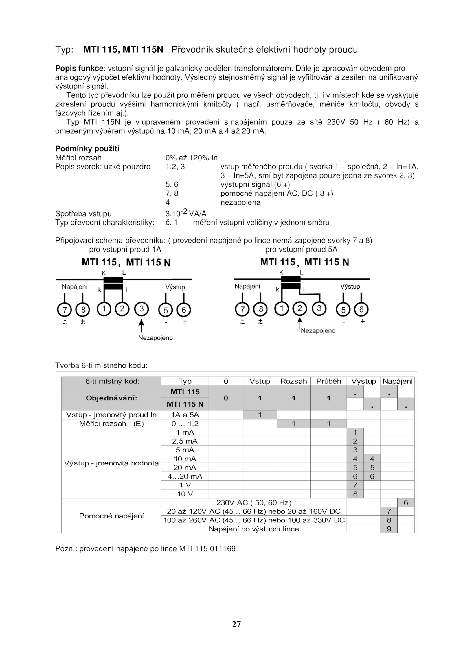 Typ: MTI 115, MTI 115N Převodník skutečné efektivní hodnoty proudu
